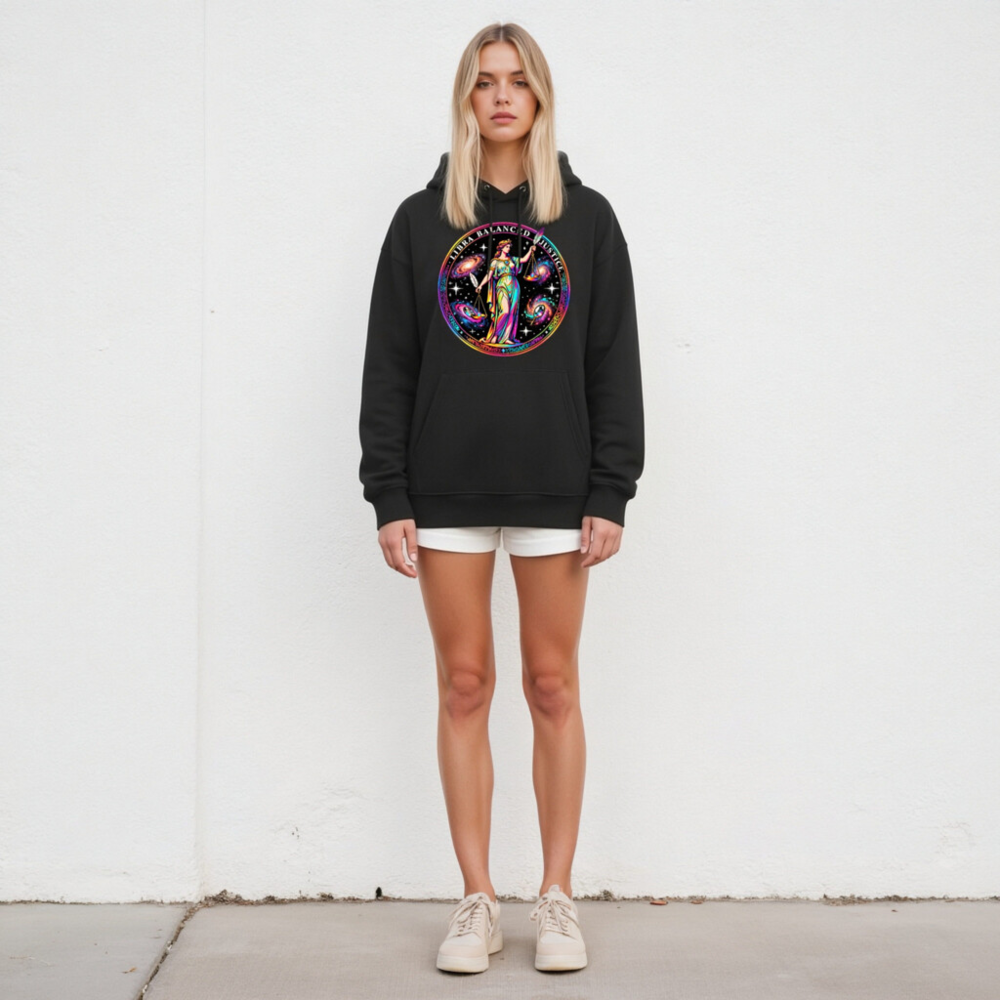 Wear the cosmic balance of Libra with this unisex essential eco hoodie. Featuring a vibrant, rainbow-hued Lady Justice holding scales and a feather against a starry galaxy backdrop, symbolizing harmony and justice. Made for comfort and sustainability—soft, durable, and ethically crafted. Perfect for astrology lovers, zodiac enthusiasts, or anyone seeking mindful style. Ideal for everyday wear or as a meaningful gift.