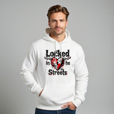 This unisex essential eco hoodie features a bold ‘Locked in the Streets’ graphic with a red heart, chain, and keyhole—symbolizing urban resilience. Made with sustainable materials, it’s designed for comfort and conscious style. The distressed typography and graffiti-inspired details add streetwear edge. Perfect for everyday wear, this versatile pullover fits all genders and celebrates authentic urban identity.