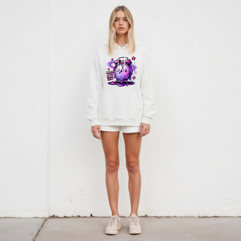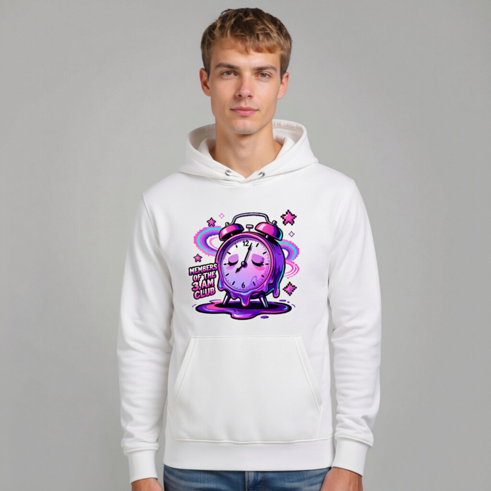 Wear your late-night spirit with this unisex eco hoodie featuring a vibrant, melting alarm clock design—’Members of the 3AM Club’—in dreamy purple-pink gradients. Made from sustainable materials, it’s soft, comfortable, and perfect for night owls. The bold graphic includes glowing stars and cosmic swirls, capturing that sleepy, surreal early-morning vibe. Ideal for casual wear, gifting, or expressing your love for the hours when the world sleeps.