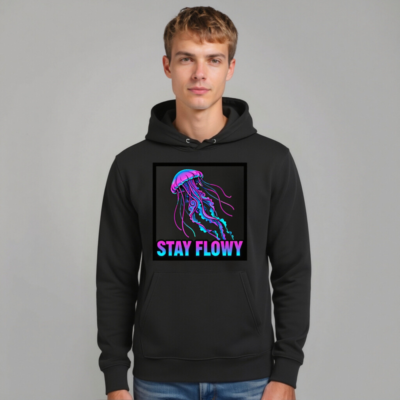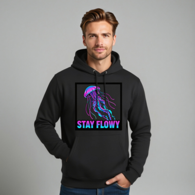 Wear our unisex essential eco hoodie featuring a vibrant neon jellyfish graphic and the motivational phrase ‘STAY FLOWY’. Made with sustainable materials for comfort and style. Perfect for everyday wear—soft, relaxed fit, and eco-conscious choice. Ideal for fans of ocean-inspired fashion and mindful living.