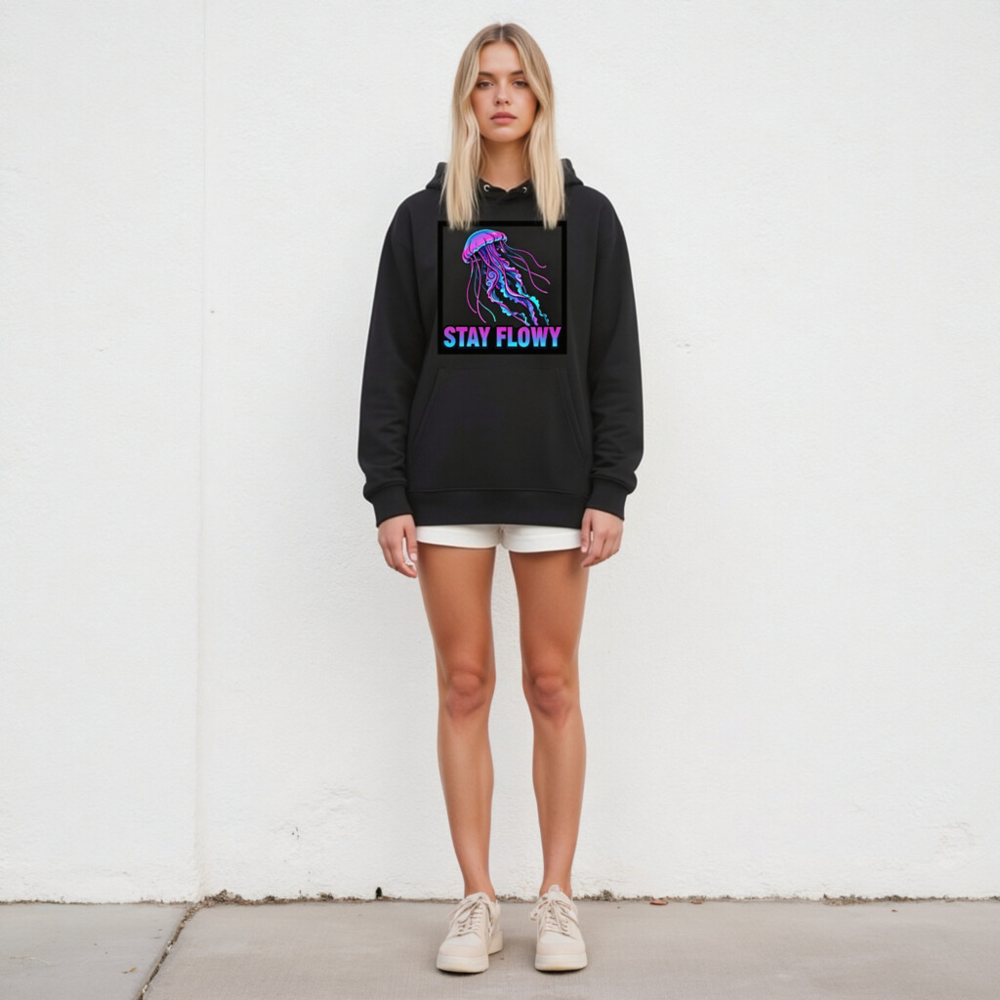 Wear our unisex essential eco hoodie featuring a vibrant neon jellyfish graphic and the motivational phrase ‘STAY FLOWY’. Made with sustainable materials for comfort and style. Perfect for everyday wear—soft, relaxed fit, and eco-conscious choice. Ideal for fans of ocean-inspired fashion and mindful living.