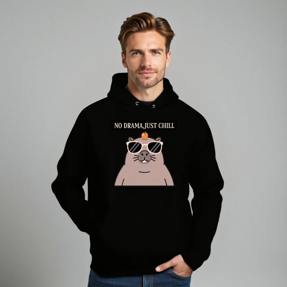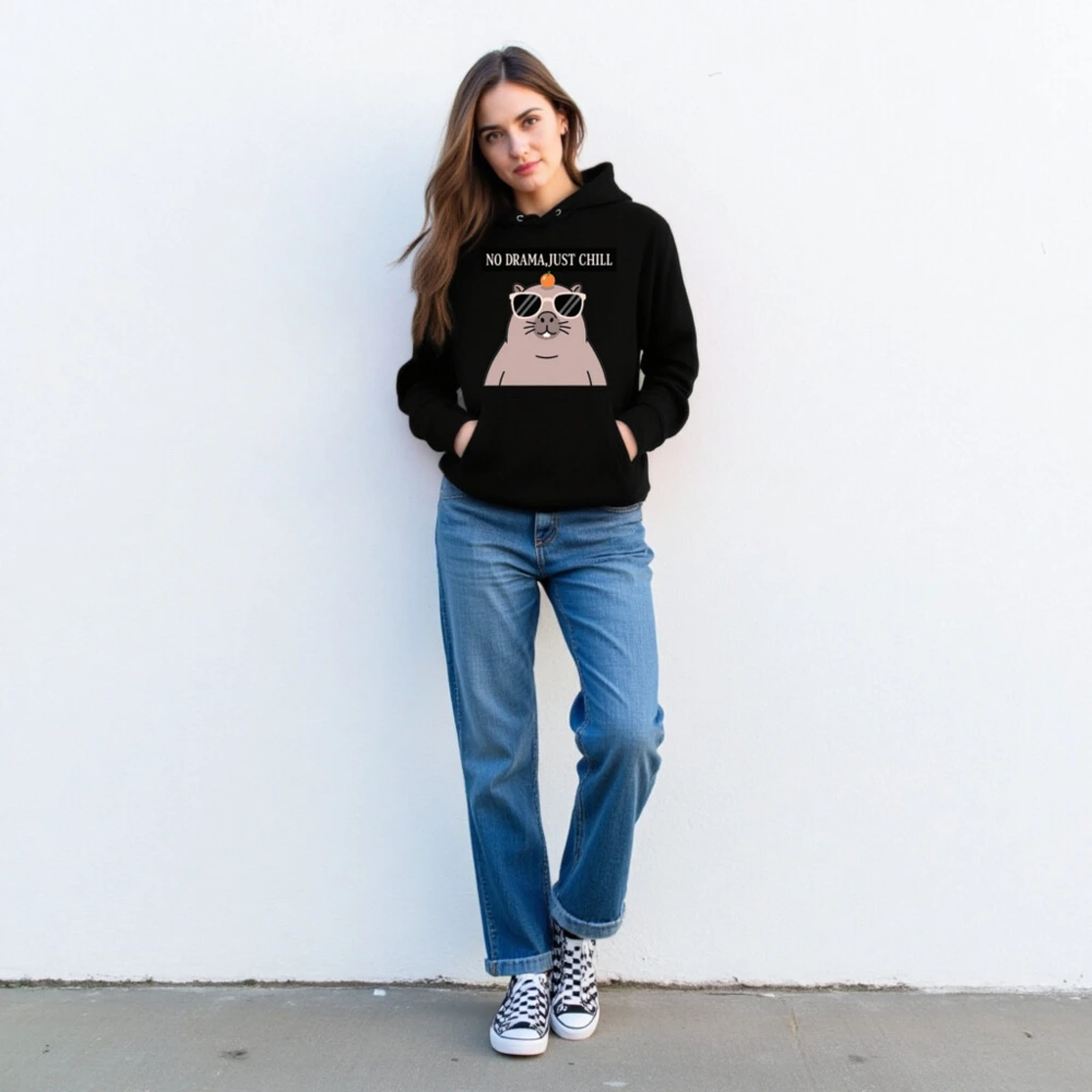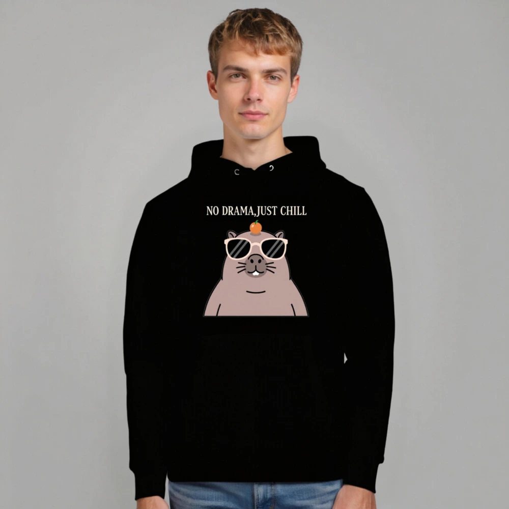This unisex essential eco hoodie features a playful gopher wearing sunglasses with an orange on its head, paired with the chill mantra ‘NO DRAMA, JUST CHILL’. Made from sustainable materials for comfort and conscience. Soft, relaxed fit—perfect for everyday wear. Designed for those who value style, sustainability, and a laid-back vibe.