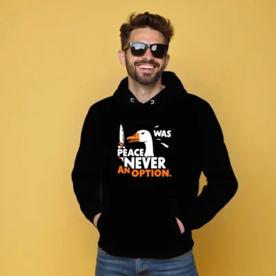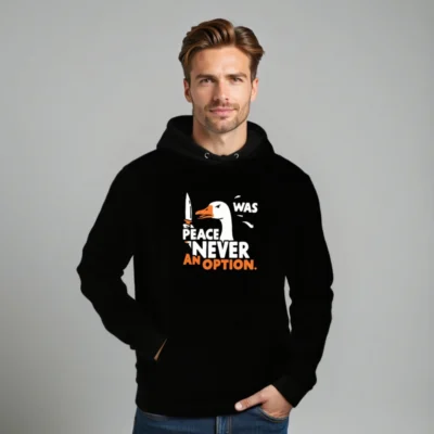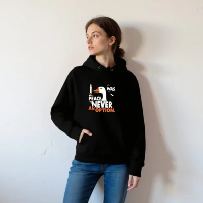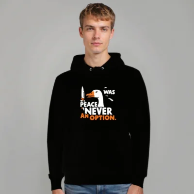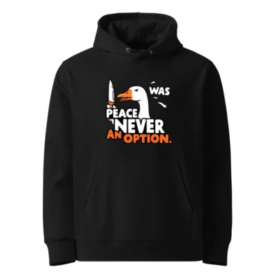 This unisex essential eco hoodie features a bold ‘Peace Was Never an Option’ design with a striking duck holding a knife. Made from sustainable materials, it’s comfortable, stylish, and perfect for everyday wear. The graphic combines humor and statement-making flair—ideal for those who value both ethics and expression. Available in all sizes, this hooded sweatshirt supports eco-conscious fashion without compromising on quality or style.
