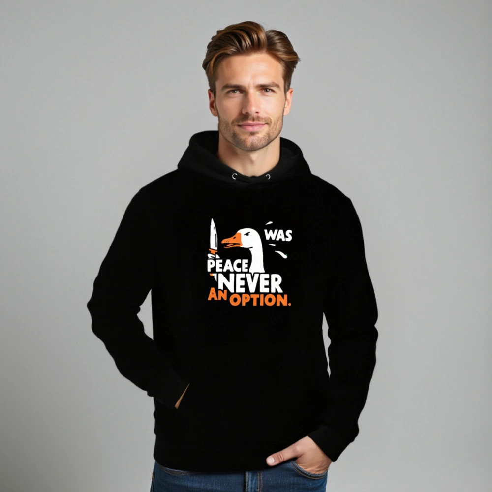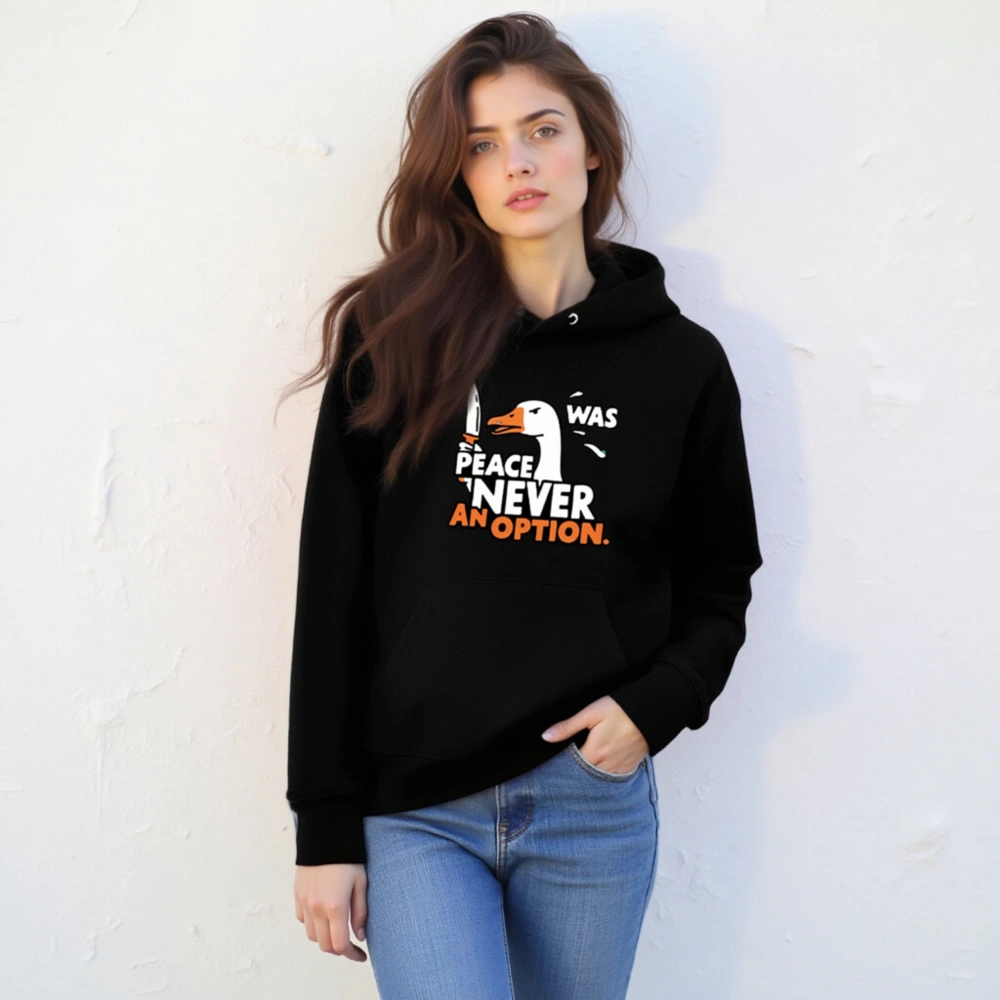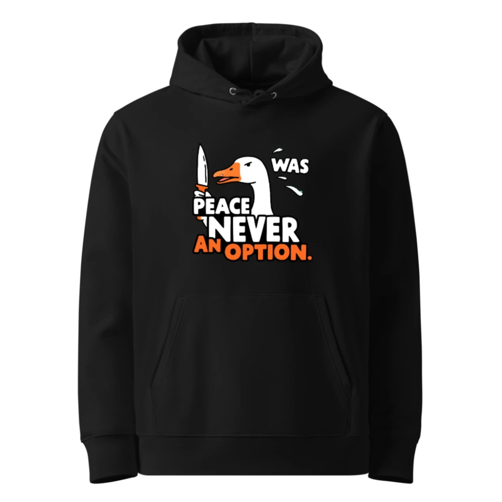 This unisex essential eco hoodie features a bold ‘Peace Was Never an Option’ design with a striking duck holding a knife. Made from sustainable materials, it’s comfortable, stylish, and perfect for everyday wear. The graphic combines humor and statement-making flair—ideal for those who value both ethics and expression. Available in all sizes, this hooded sweatshirt supports eco-conscious fashion without compromising on quality or style.