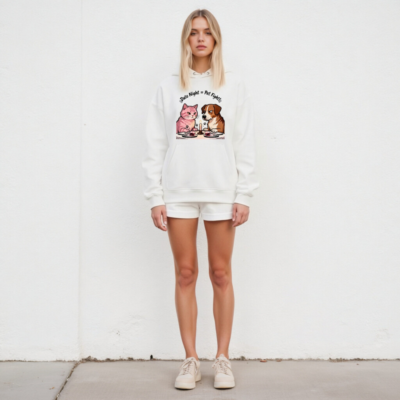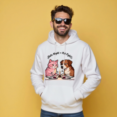 A unisex essential eco hoodie featuring a humorous ‘Date Night = Pet Fight!’ design with a pink cat and brown dog at candlelit dinner. Made from sustainable materials, this comfortable hoodie blends pet lover humor with everyday style. Ideal for casual wear, gifts, or self-expression—soft, relaxed fit, eco-conscious choice.