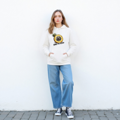 This unisex essential eco hoodie features a bold, steampunk-inspired pineapple with a mechanical gear core and the rebellious slogan ‘RUNCH THE SYSTEM’. Crafted for comfort and sustainability, it’s designed for everyday wear with a relaxed fit. The vibrant graphic stands out against the clean white fabric, making it a statement piece for those who value both style and ethical production. Ideal for fans of edgy, symbolic streetwear.