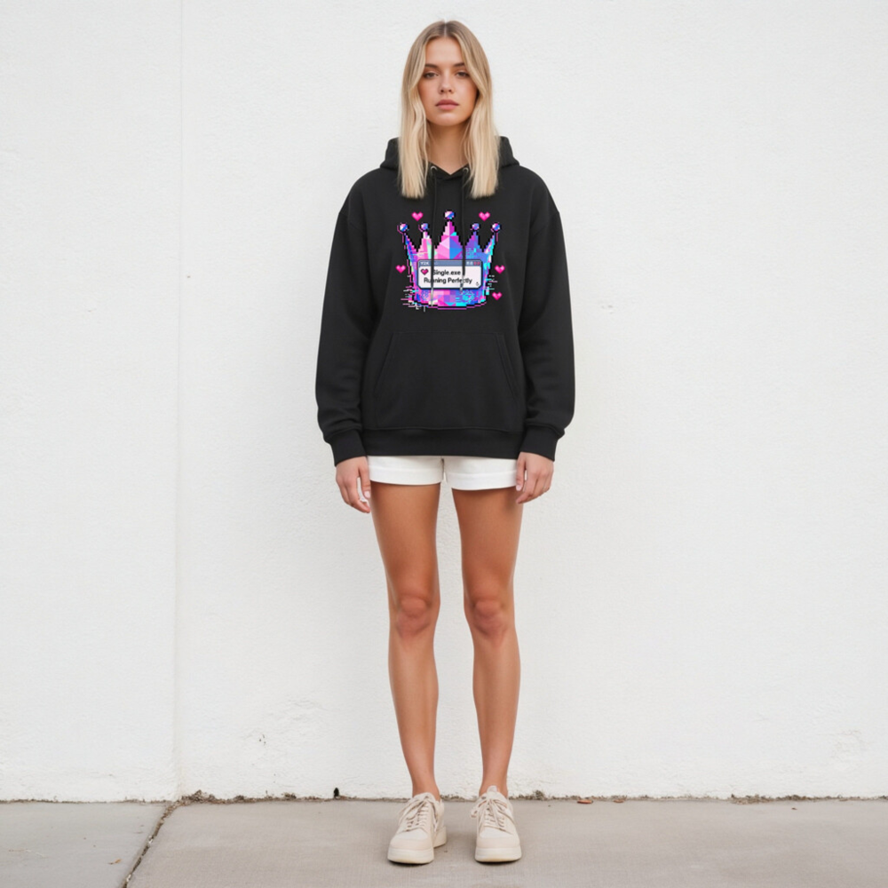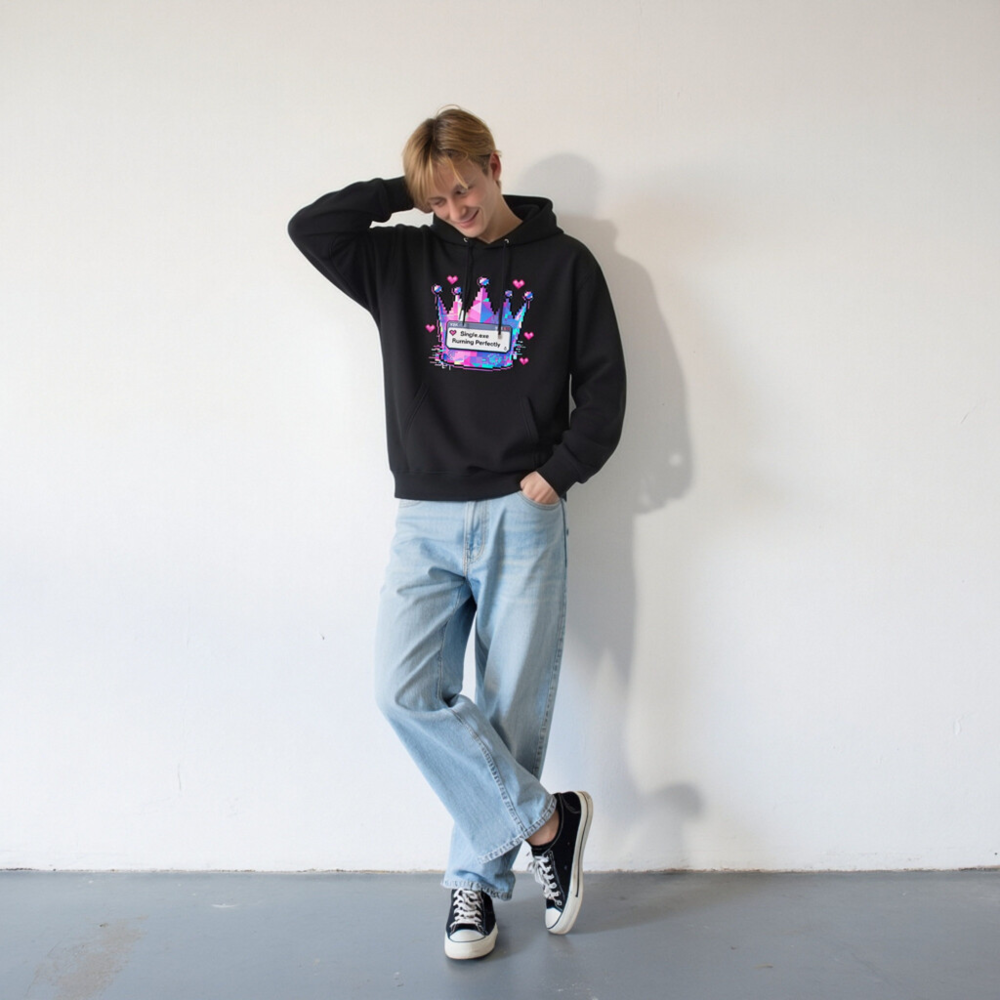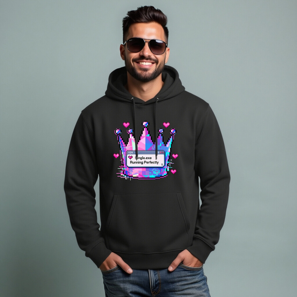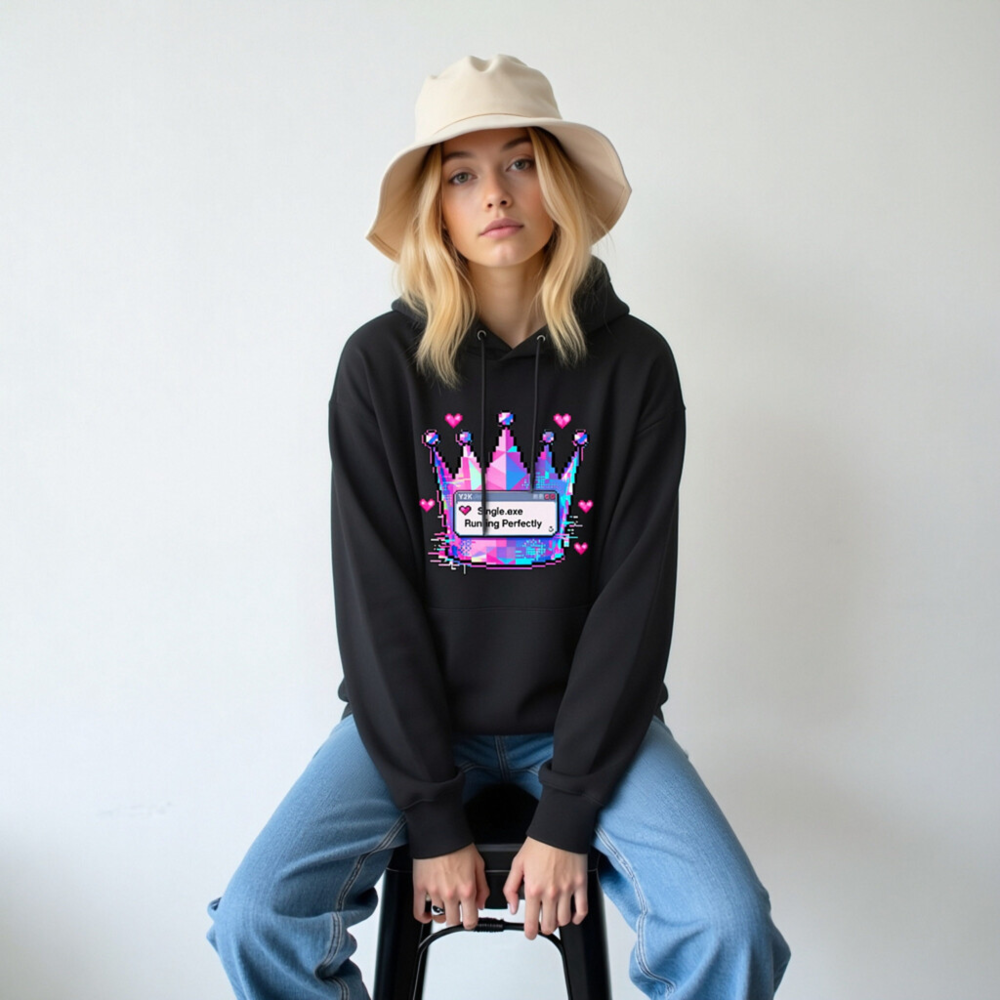 This unisex essential eco hoodie features a vibrant pixel-art crown with glitch effects and a nostalgic ‘Single.exe Running Perfectly’ system message—perfect for digital natives. Made with eco-friendly materials, it’s designed for comfort, sustainability, and bold self-expression. Ideal for everyday wear, gaming fans, and tech lovers who appreciate retro-futuristic aesthetics.