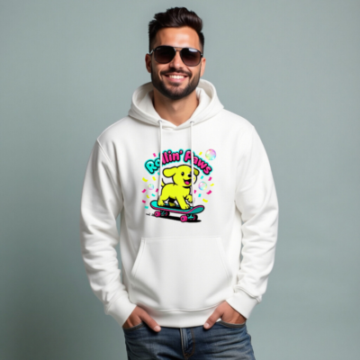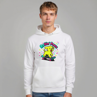 Show off your playful side with this unisex essential eco hoodie—featuring a vibrant yellow puppy riding a skateboard under the ‘Rollin’ Paws’ slogan. Made for comfort and sustainability, it’s designed for everyday wear with a relaxed fit, front pouch pocket, and soft cotton blend. Perfect for casual outings or as a fun gift—celebrate joy, movement, and eco-conscious style.