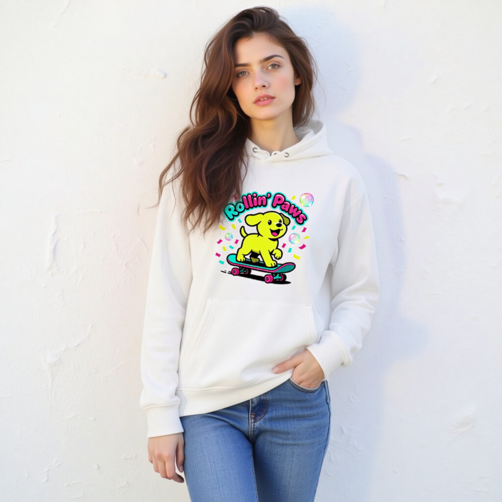 Show off your playful side with this unisex essential eco hoodie—featuring a vibrant yellow puppy riding a skateboard under the ‘Rollin’ Paws’ slogan. Made for comfort and sustainability, it’s designed for everyday wear with a relaxed fit, front pouch pocket, and soft cotton blend. Perfect for casual outings or as a fun gift—celebrate joy, movement, and eco-conscious style.