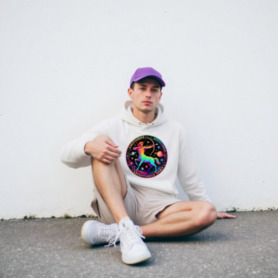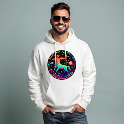 Celebrate your zodiac spirit with this unisex eco hoodie featuring a vibrant, rainbow-hued Sagittarius centaur archer against a cosmic backdrop. Crafted for comfort and sustainability, it’s designed for adventurers who embrace curiosity and exploration. The bold circular graphic highlights ‘Sagittarius’ and ‘Adventurous Spirit’—perfect for astrology lovers seeking meaningful, stylish wear.