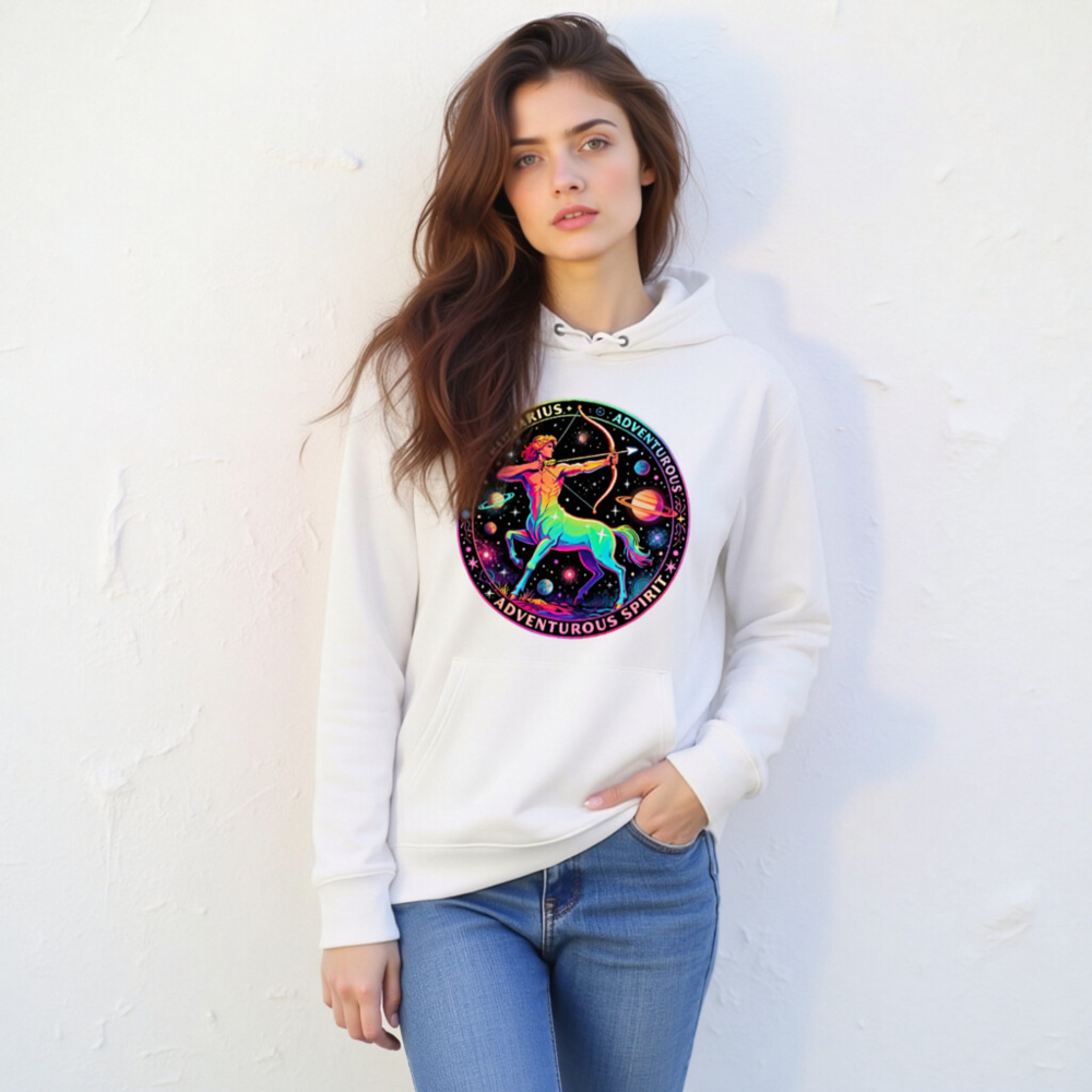 Celebrate your zodiac spirit with this unisex eco hoodie featuring a vibrant, rainbow-hued Sagittarius centaur archer against a cosmic backdrop. Crafted for comfort and sustainability, it’s designed for adventurers who embrace curiosity and exploration. The bold circular graphic highlights ‘Sagittarius’ and ‘Adventurous Spirit’—perfect for astrology lovers seeking meaningful, stylish wear.