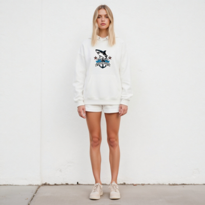 This unisex essential eco hoodie features a bold nautical design with a leaping shark, anchor, and ‘Deep Blue Danger’ banner—perfect for ocean lovers. Made with sustainable materials, it’s comfortable, versatile, and ideal for everyday wear. The premium print resists fading, and the relaxed fit suits all genders. A stylish statement piece that supports eco-conscious fashion.