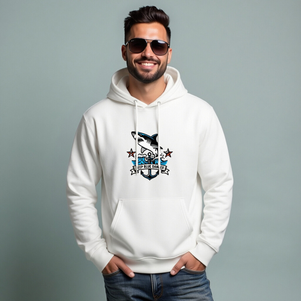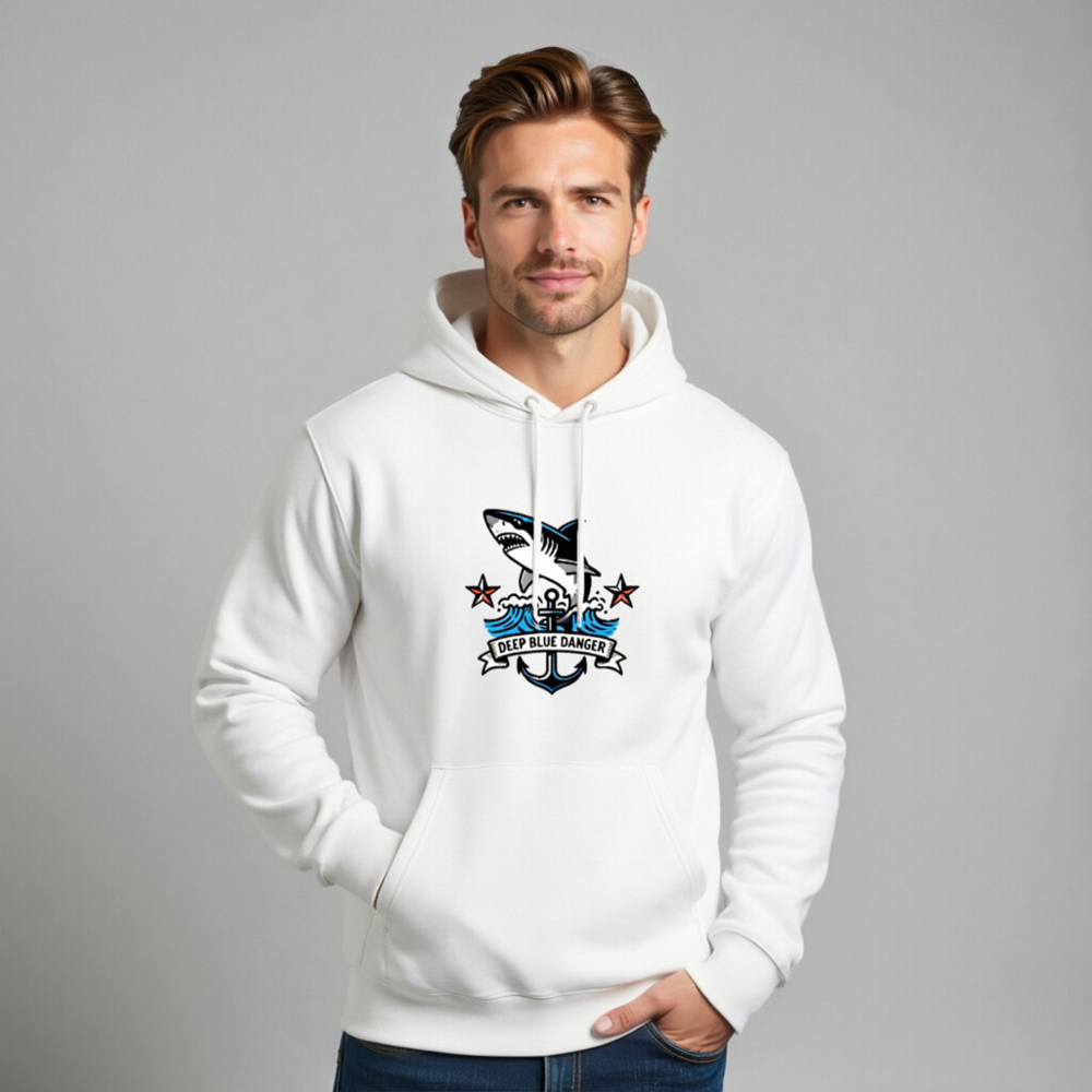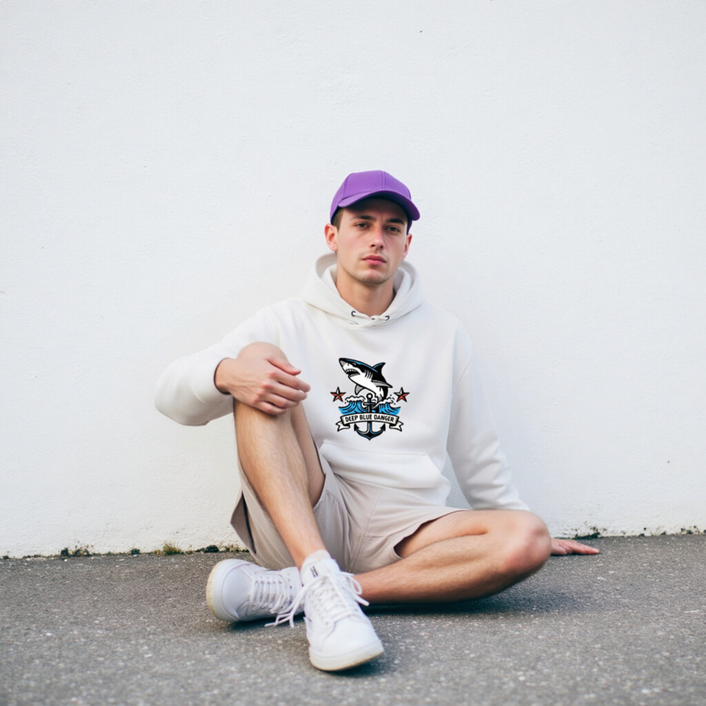 This unisex essential eco hoodie features a bold nautical design with a leaping shark, anchor, and ‘Deep Blue Danger’ banner—perfect for ocean lovers. Made with sustainable materials, it’s comfortable, versatile, and ideal for everyday wear. The premium print resists fading, and the relaxed fit suits all genders. A stylish statement piece that supports eco-conscious fashion.