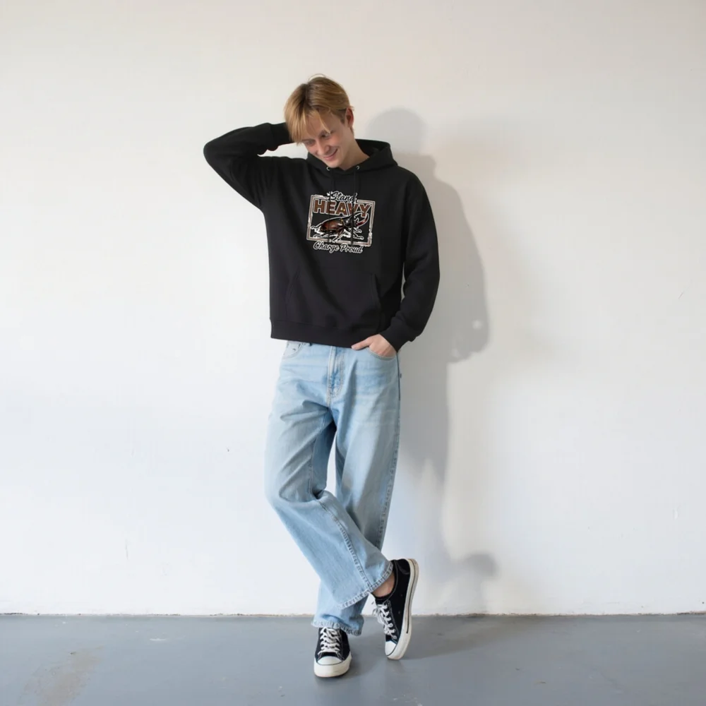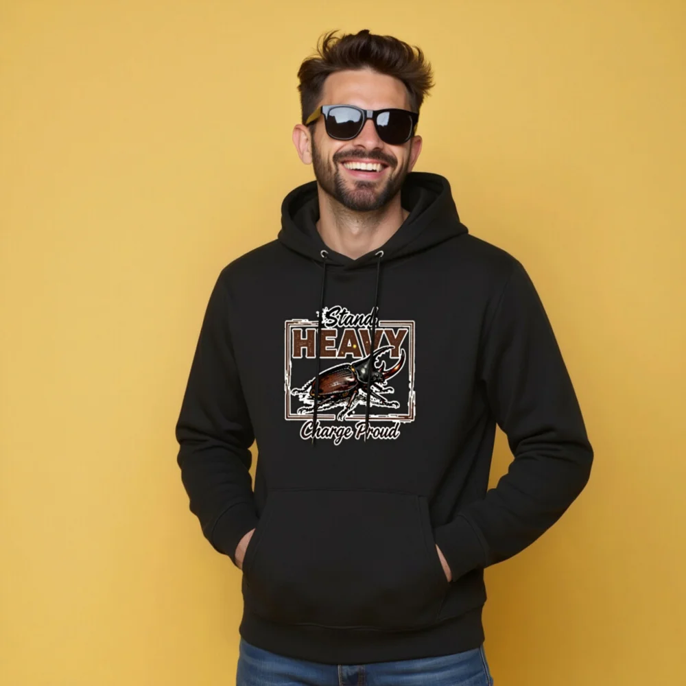This unisex essential eco hoodie features a bold rhinoceros beetle graphic with the empowering slogan ‘Stand Heavy, Charge Proud’—a statement of strength and resilience. Crafted for comfort and sustainability, it’s designed for everyday wear with a relaxed fit, front pouch pocket, and durable ribbed cuffs & hem. Perfect for nature lovers, entomology enthusiasts, and anyone who values bold, meaningful style.