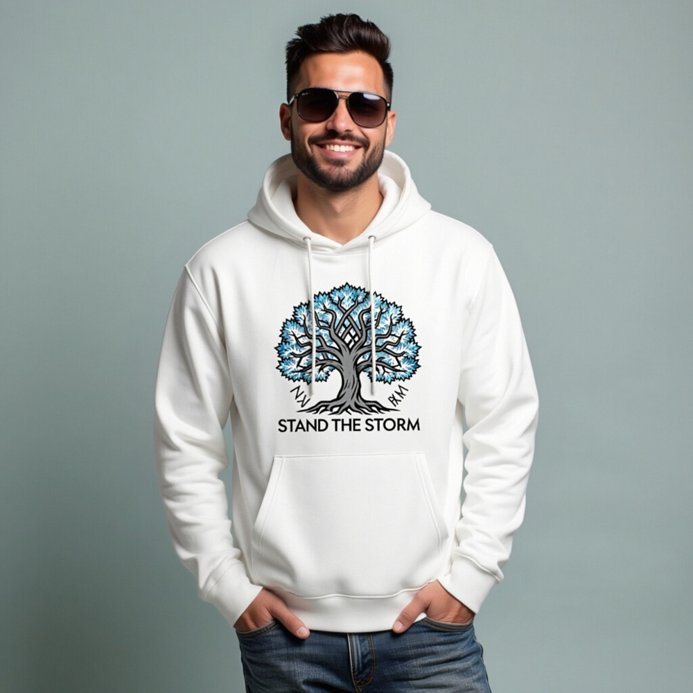 Wear resilience with our Unisex Essential Eco Hoodie—featuring the iconic ‘Stand the Storm’ tree design in blue and gray. Made from sustainable cotton blend, this comfortable, gender-neutral hoodie supports eco-conscious style. The bold graphic and meaningful slogan inspire strength and environmental awareness. Soft, durable, and designed for everyday wear—ideal for those who value both comfort and purpose.