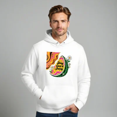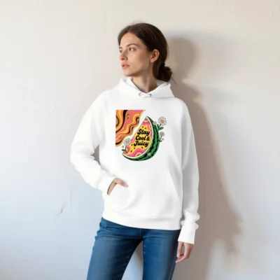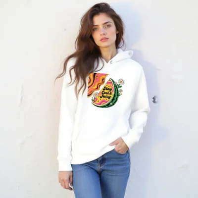 Eco-friendly unisex hoodie featuring a vibrant watermelon slice with psychedelic swirls and daisies, printed with non-toxic ink. Soft, sustainable cotton blend for comfort and style. Designed for everyday wear — cool, juicy, and planet-conscious. Ideal for casual outings or summer vibes.