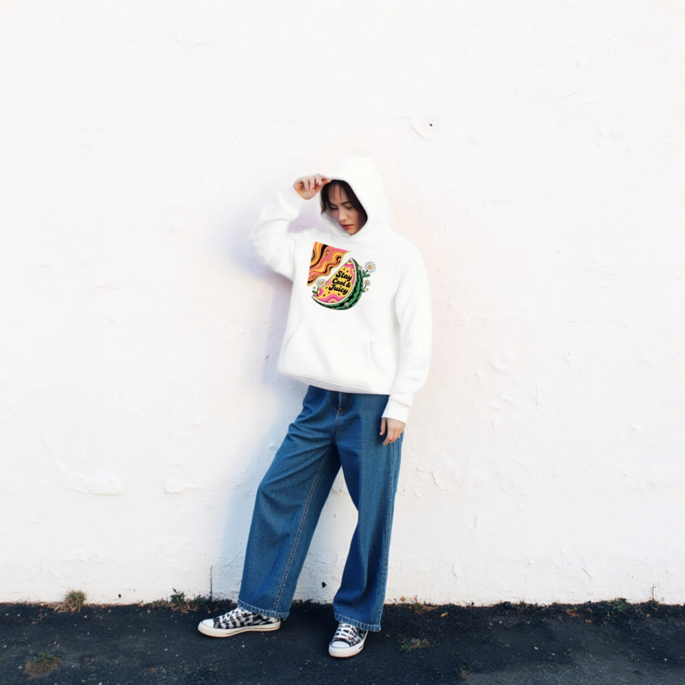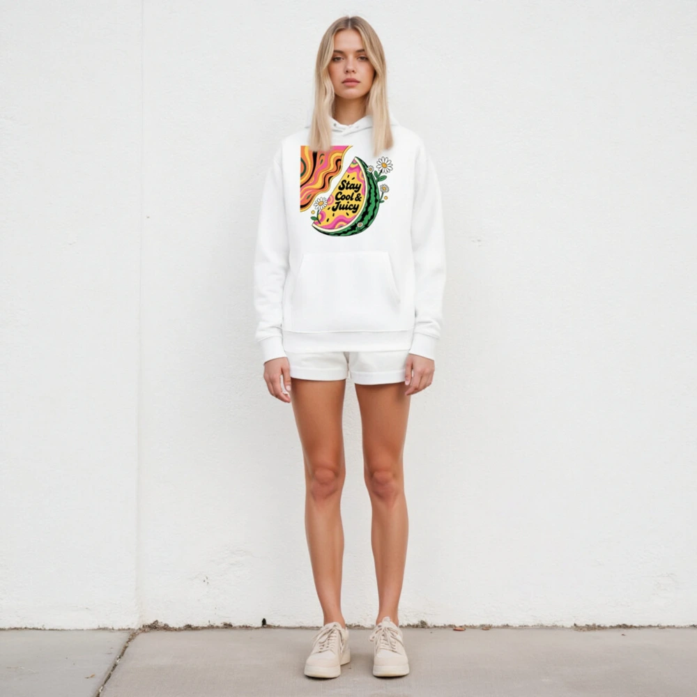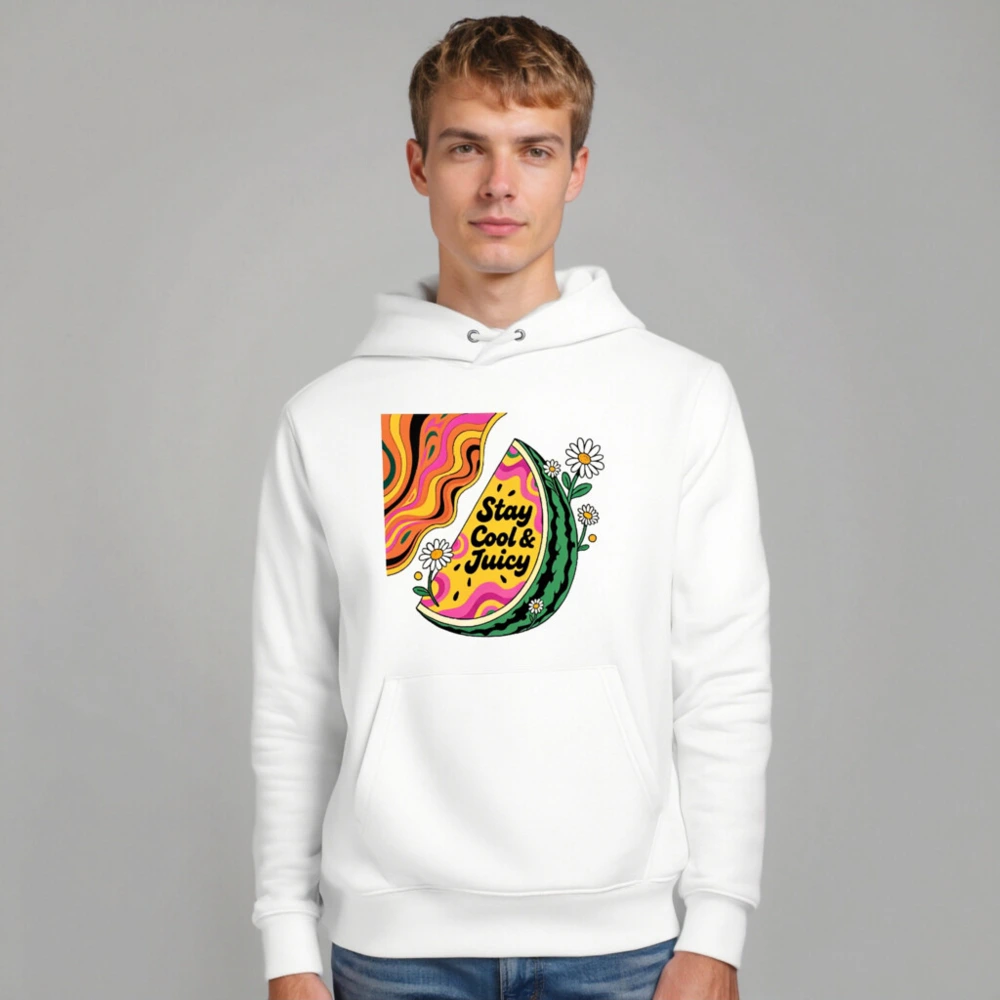 Eco-friendly unisex hoodie featuring a vibrant watermelon slice with psychedelic swirls and daisies, printed with non-toxic ink. Soft, sustainable cotton blend for comfort and style. Designed for everyday wear — cool, juicy, and planet-conscious. Ideal for casual outings or summer vibes.