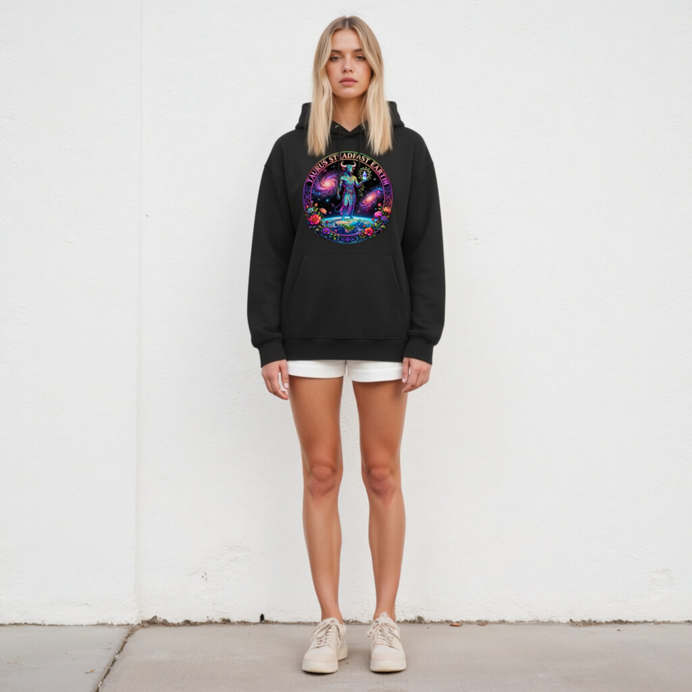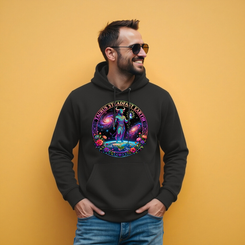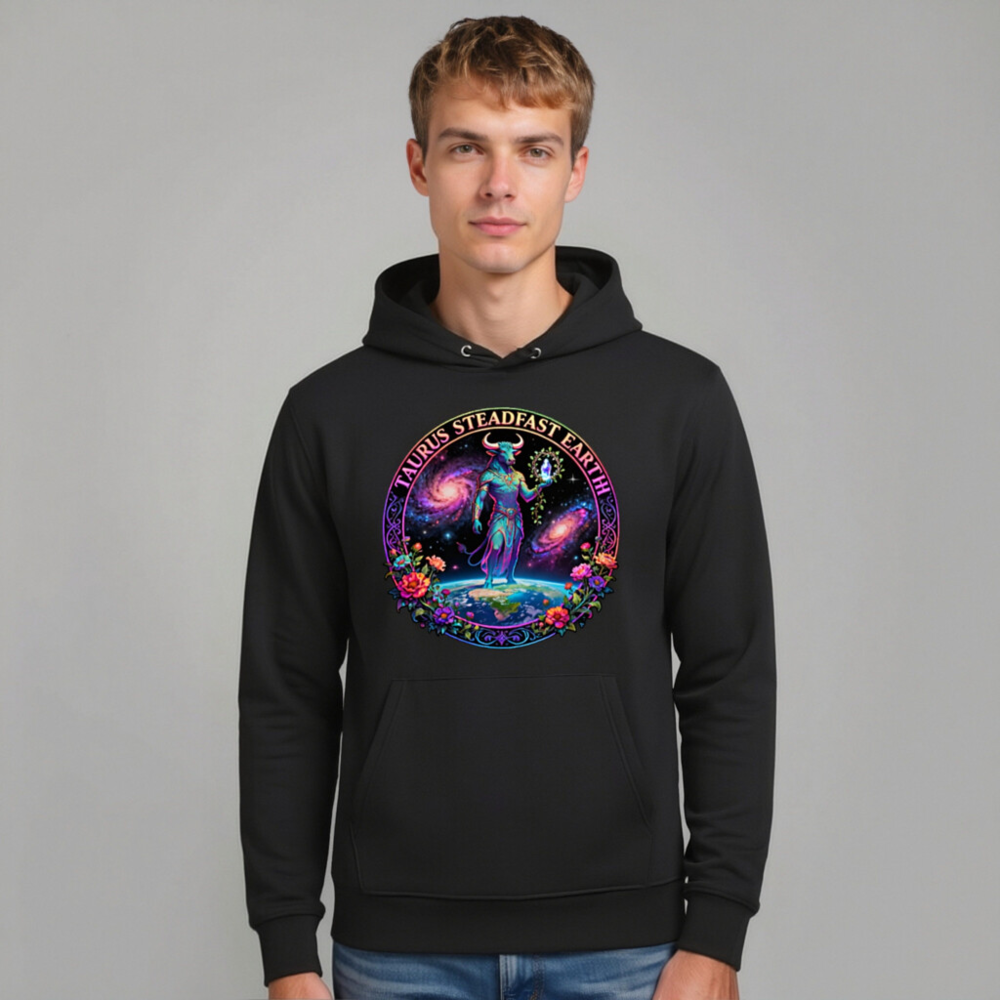 Wear the cosmic power of Taurus with this unisex eco hoodie featuring a vibrant, celestial bull standing atop Earth amid galaxies and floral wreath. Made with sustainable materials for comfort and conscience. Perfect for astrology lovers, earth guardians, and cosmic fashion enthusiasts seeking steady energy and ethical style.