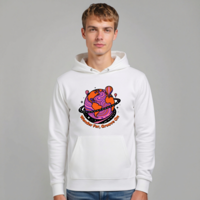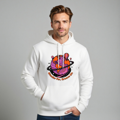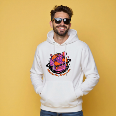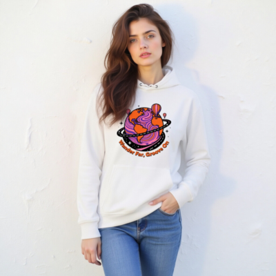 Wear comfort and conscious style with this unisex eco hoodie—crafted for everyday ease and planet-friendly values. The vibrant ‘Wander Far, Groove On’ design features a psychedelic Earth with hot air balloons and cosmic swirls, perfect for travelers and dreamers. Made from sustainable materials, it’s soft, durable, and built to last. Ideal for casual wear, gifting, or making a statement. Comfort meets conscience—your next favorite hoodie.