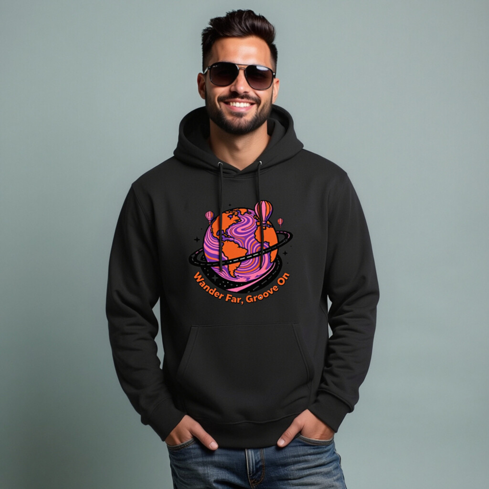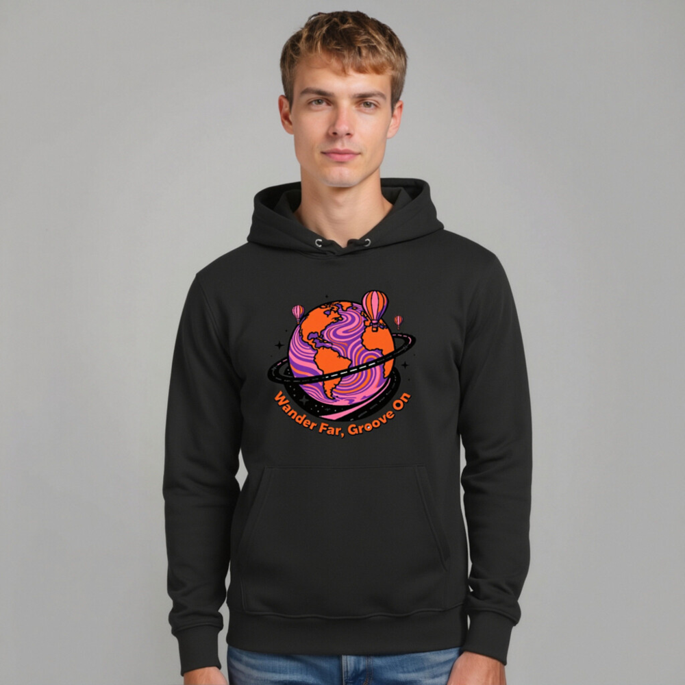 Wear our Unisex Essential Eco Hoodie—crafted for comfort and conscience. Featuring a vibrant ‘Wander Far, Groove On’ globe design with hot air balloons and psychedelic swirls, this sustainable hoodie combines bold artistry with everyday ease. Made from eco-conscious materials, it’s designed for conscious travelers who value style and sustainability. Perfect for gifting or self-care.