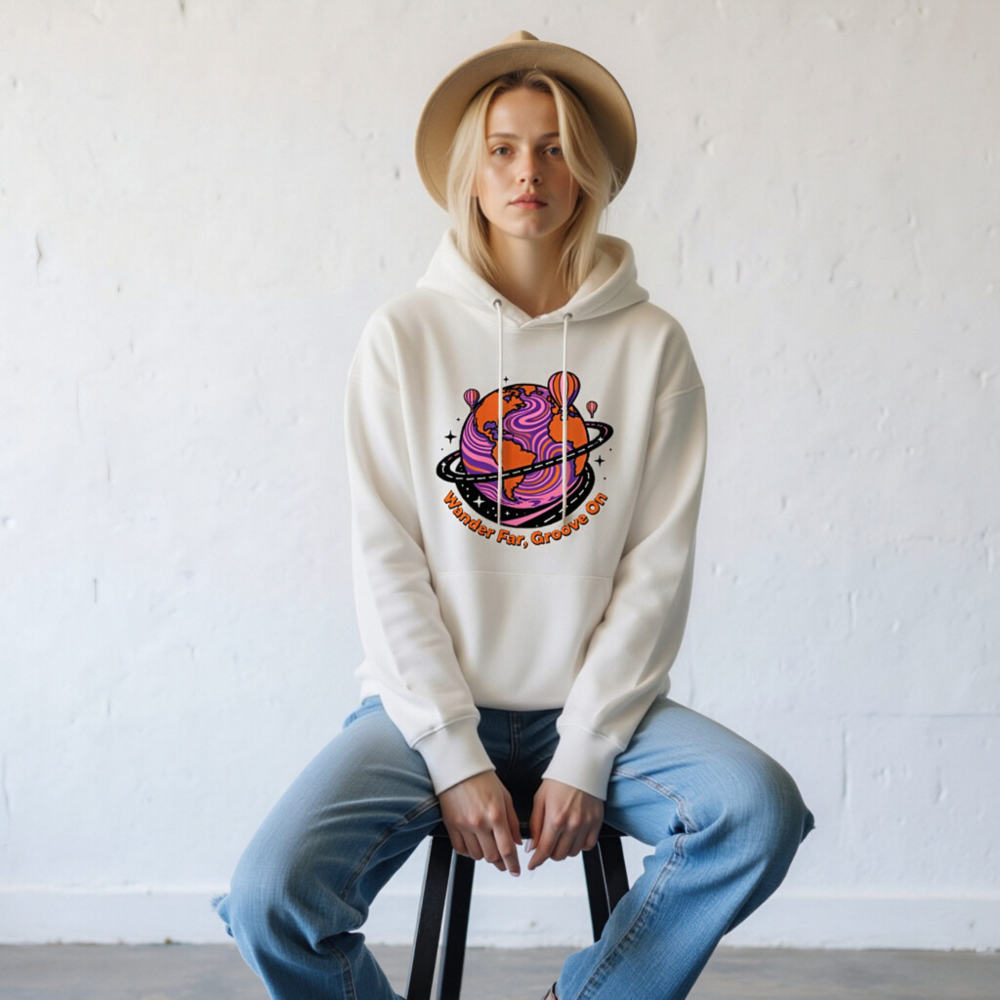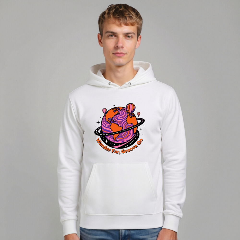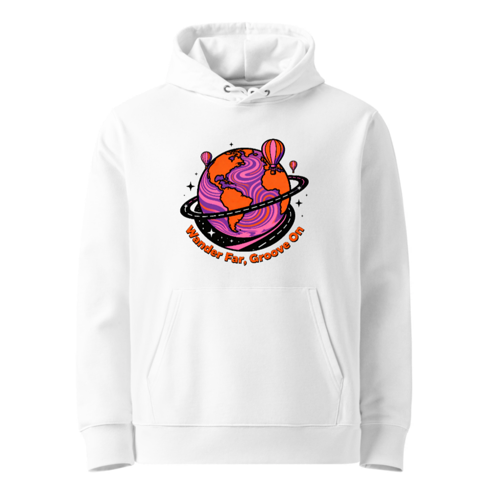 Wear comfort and conscious style with this unisex eco hoodie—crafted for everyday ease and planet-friendly values. The vibrant ‘Wander Far, Groove On’ design features a psychedelic Earth with hot air balloons and cosmic swirls, perfect for travelers and dreamers. Made from sustainable materials, it’s soft, durable, and built to last. Ideal for casual wear, gifting, or making a statement. Comfort meets conscience—your next favorite hoodie.