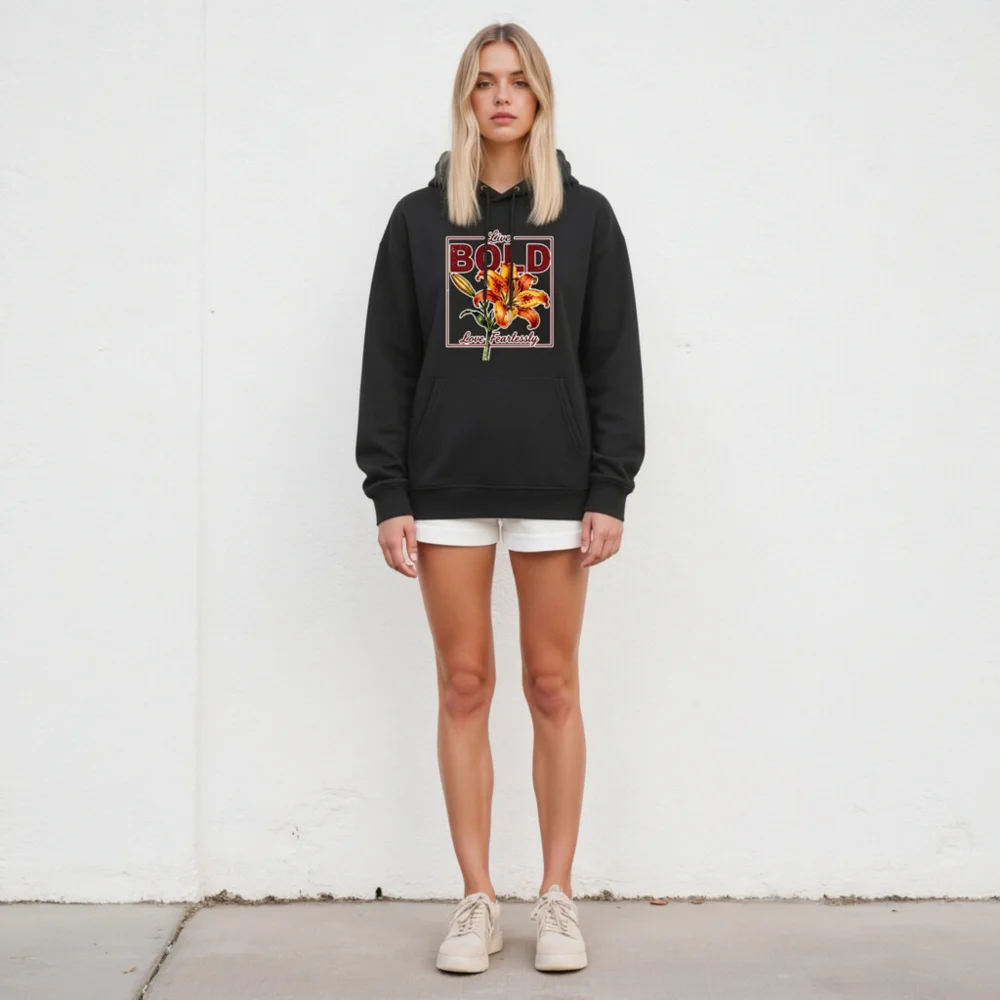 This unisex essential eco hoodie features a vibrant orange lily print with ‘Live Bold, Love Fearlessly’ typography—perfect for expressive, conscious wear. Made from soft, sustainable materials, it offers comfort and durability for everyday use. The classic pullover design includes a front pocket, adjustable drawstring hood, and ribbed cuffs. Ideal for casual outings, layering, or gifting, this hoodie blends bold aesthetics with eco-friendly values. Lightweight yet warm, it’s a versatile staple for all seasons. Embrace confidence and sustainability in one statement piece.
