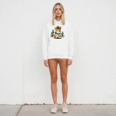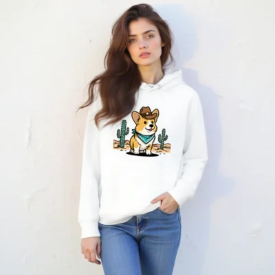 This unisex essential eco hoodie features a charming corgi in cowboy hat and bandana, set against a desert cactus backdrop — perfect for casual wear. Made from sustainable cotton blend, it’s designed for comfort and everyday style. The bold, playful graphic appeals to dog lovers and western fans alike. Ideal as a gift or personal wardrobe staple. Eco-friendly construction supports responsible consumption.