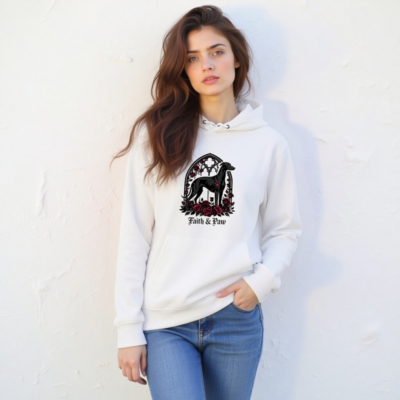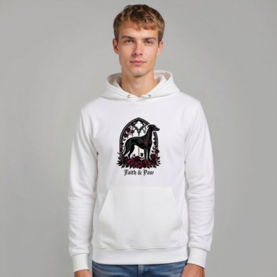 This unisex essential eco hoodie features a striking Gothic-style greyhound silhouette framed by red roses and stained-glass arches, with ‘Faith & Paw’ text beneath. Made from sustainable materials, it’s designed for comfort, durability, and conscious style—perfect for pet lovers who value ethical fashion. Lightweight, soft, and machine-washable; available in classic white for everyday wear.