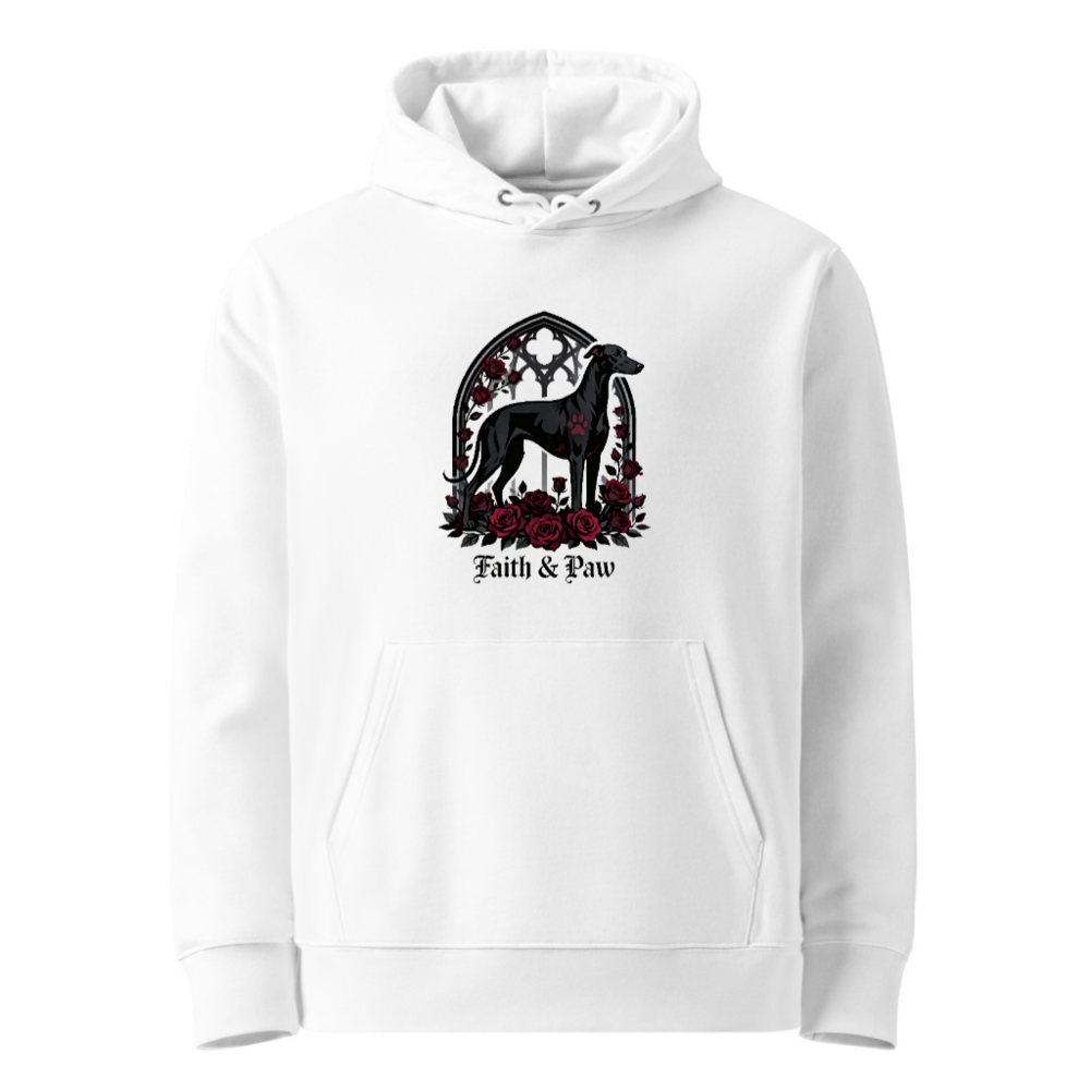 This unisex essential eco hoodie features a striking Gothic-style greyhound silhouette framed by red roses and stained-glass arches, with ‘Faith & Paw’ text beneath. Made from sustainable materials, it’s designed for comfort, durability, and conscious style—perfect for pet lovers who value ethical fashion. Lightweight, soft, and machine-washable; available in classic white for everyday wear.