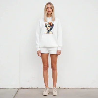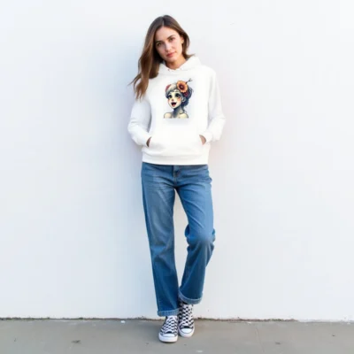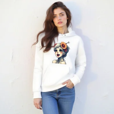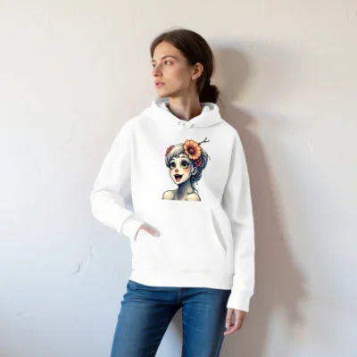 This unisex essential eco hoodie features a charming floral girl illustration—soft gray hair adorned with orange and red flowers, expressive yellow eyes, and gentle blush. Made from sustainable materials, it’s designed for comfort, versatility, and everyday wear. Perfect for casual outings or layering. The clean white base highlights the vibrant artwork, making it a standout piece for nature lovers and art enthusiasts. Ideal for all genders seeking ethical fashion.
