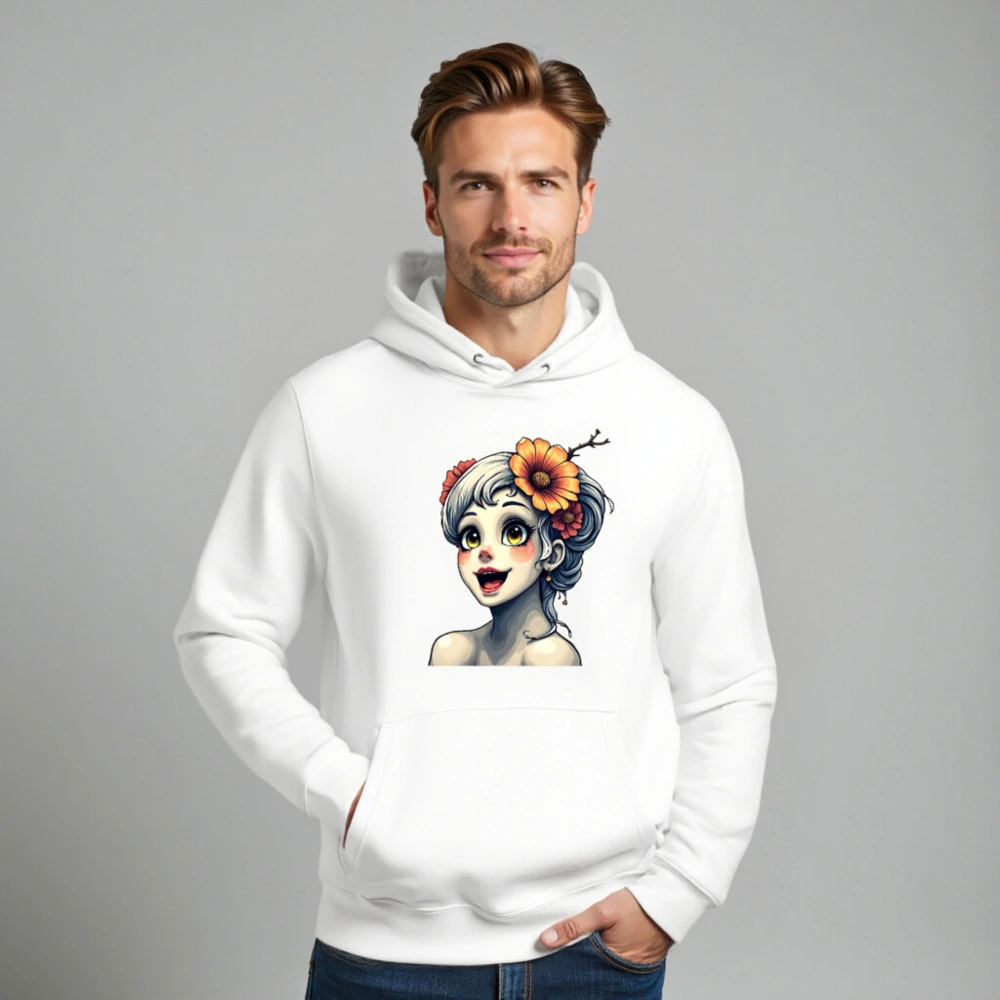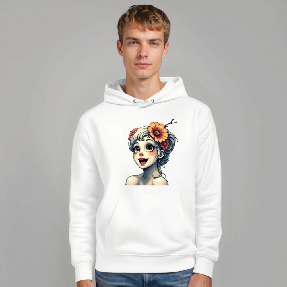 This unisex essential eco hoodie features a charming floral girl illustration—soft gray hair adorned with orange and red flowers, expressive yellow eyes, and gentle blush. Made from sustainable materials, it’s designed for comfort, versatility, and everyday wear. Perfect for casual outings or layering. The clean white base highlights the vibrant artwork, making it a standout piece for nature lovers and art enthusiasts. Ideal for all genders seeking ethical fashion.