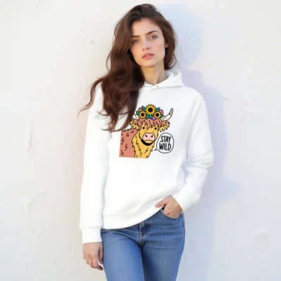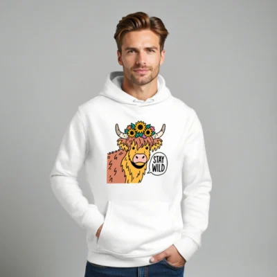 This unisex essential eco hoodie features a charming Highland cow adorned with sunflowers and a ‘Stay Wild’ speech bubble—perfect for nature lovers. Made with sustainable materials, it’s designed for comfort and conscious style. The bold graphic stands out on this soft, versatile hoodie. Ideal for everyday wear or gifting. Eco-friendly choice without compromising on fun, bold design.