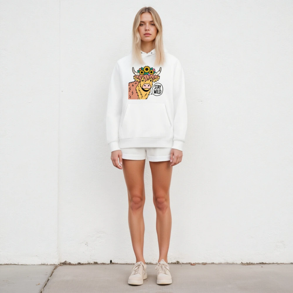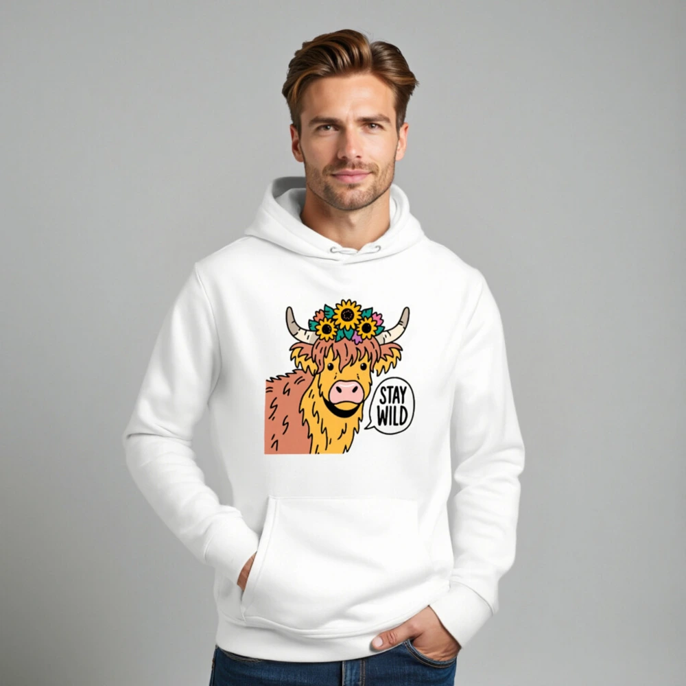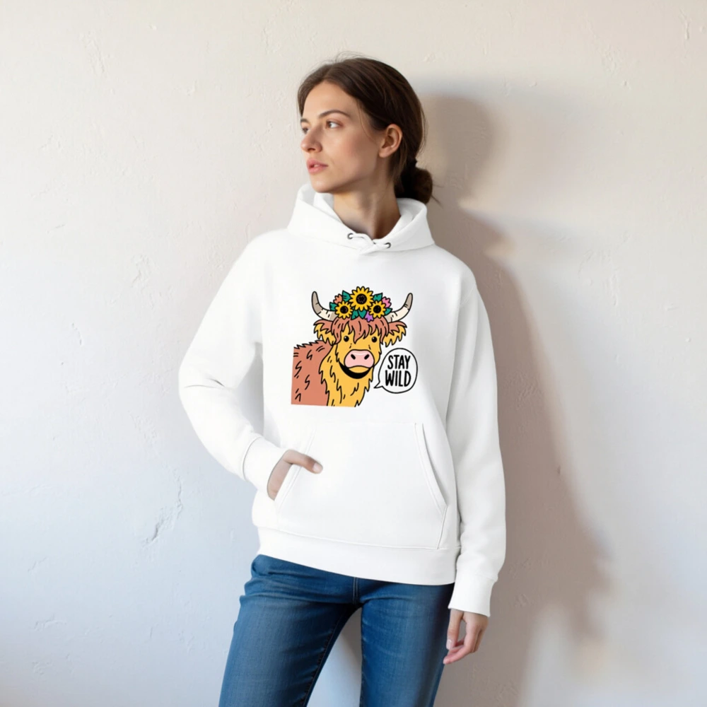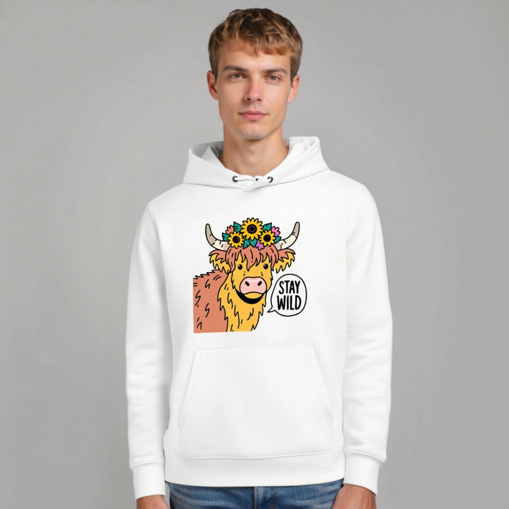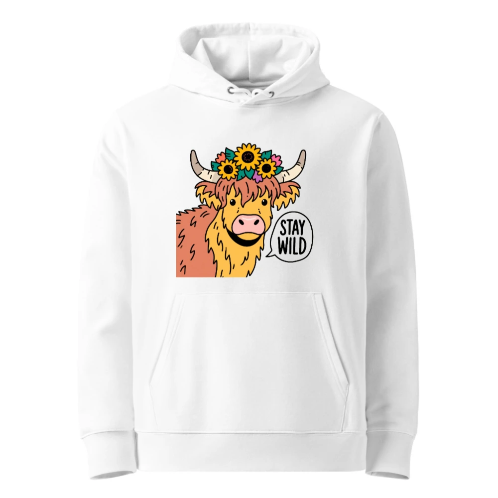 This unisex essential eco hoodie features a charming Highland cow adorned with sunflowers and a ‘Stay Wild’ speech bubble—perfect for nature lovers. Made with sustainable materials, it’s designed for comfort and conscious style. The bold graphic stands out on this soft, versatile hoodie. Ideal for everyday wear or gifting. Eco-friendly choice without compromising on fun, bold design.