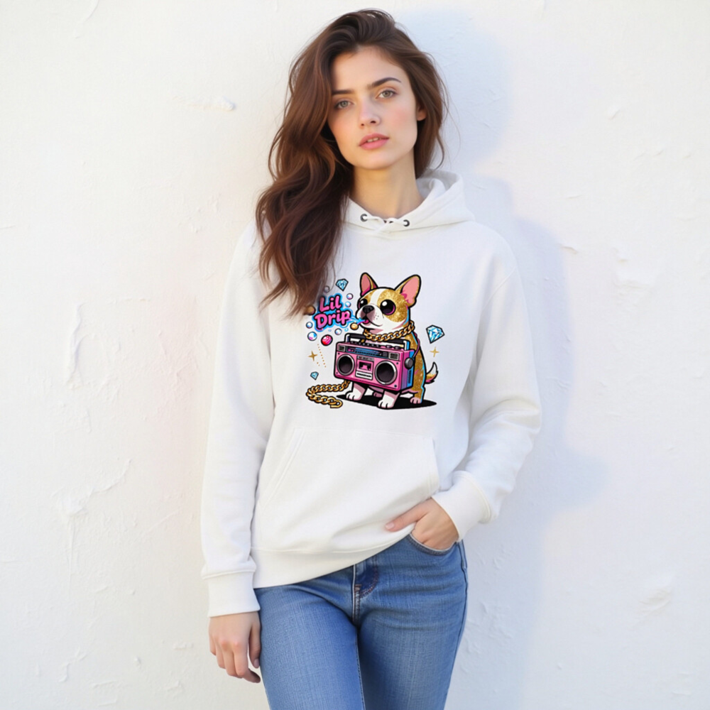 Unisex Eco Hoodie with Lil Drip Dog & Boombox Graphic – Sustainable Casual Wear