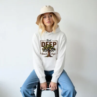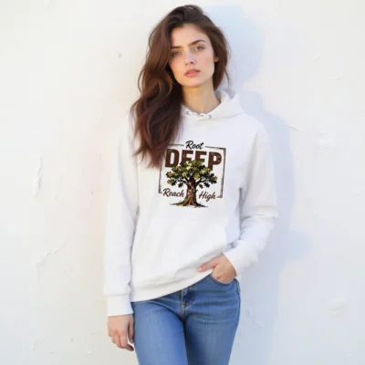 This unisex essential eco hoodie features a meaningful ‘Root Deep, Reach High’ tree graphic—symbolizing strength, growth, and resilience. Made from sustainable, soft cotton-blend fabric for all-day comfort. Perfect for casual wear, outdoor adventures, or mindful gifting. The classic pullover style includes a front pocket, adjustable drawstring hood, and ribbed cuffs. Ideal for eco-conscious individuals who value purpose-driven design. Machine washable and durable. A thoughtful blend of style, sustainability, and inspiration.