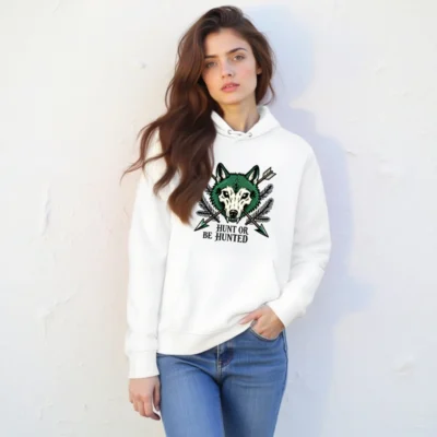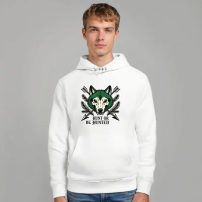 This unisex essential eco hoodie features a striking green wolf head with crossed arrows and pine branches, embodying wilderness spirit. Made with sustainable materials for conscious consumers. The bold ‘Hunt or Be Hunted’ slogan adds attitude—perfect for outdoor lovers and minimalist style seekers. Comfortable, versatile, and ethically crafted for everyday wear.