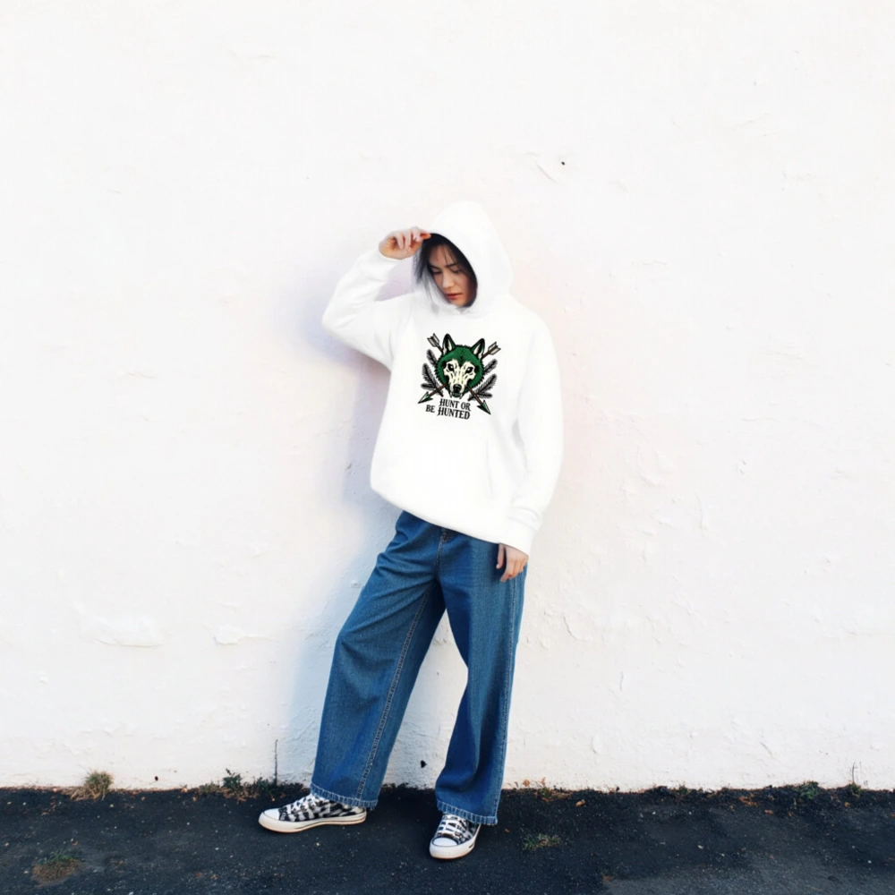 This unisex essential eco hoodie features a striking green wolf head with crossed arrows and pine branches, embodying wilderness spirit. Made with sustainable materials for conscious consumers. The bold ‘Hunt or Be Hunted’ slogan adds attitude—perfect for outdoor lovers and minimalist style seekers. Comfortable, versatile, and ethically crafted for everyday wear.