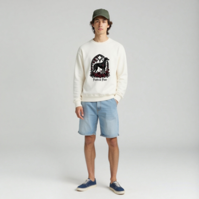 - Double-needle stitched collar, shoulders, armholes, cuffs, and hem