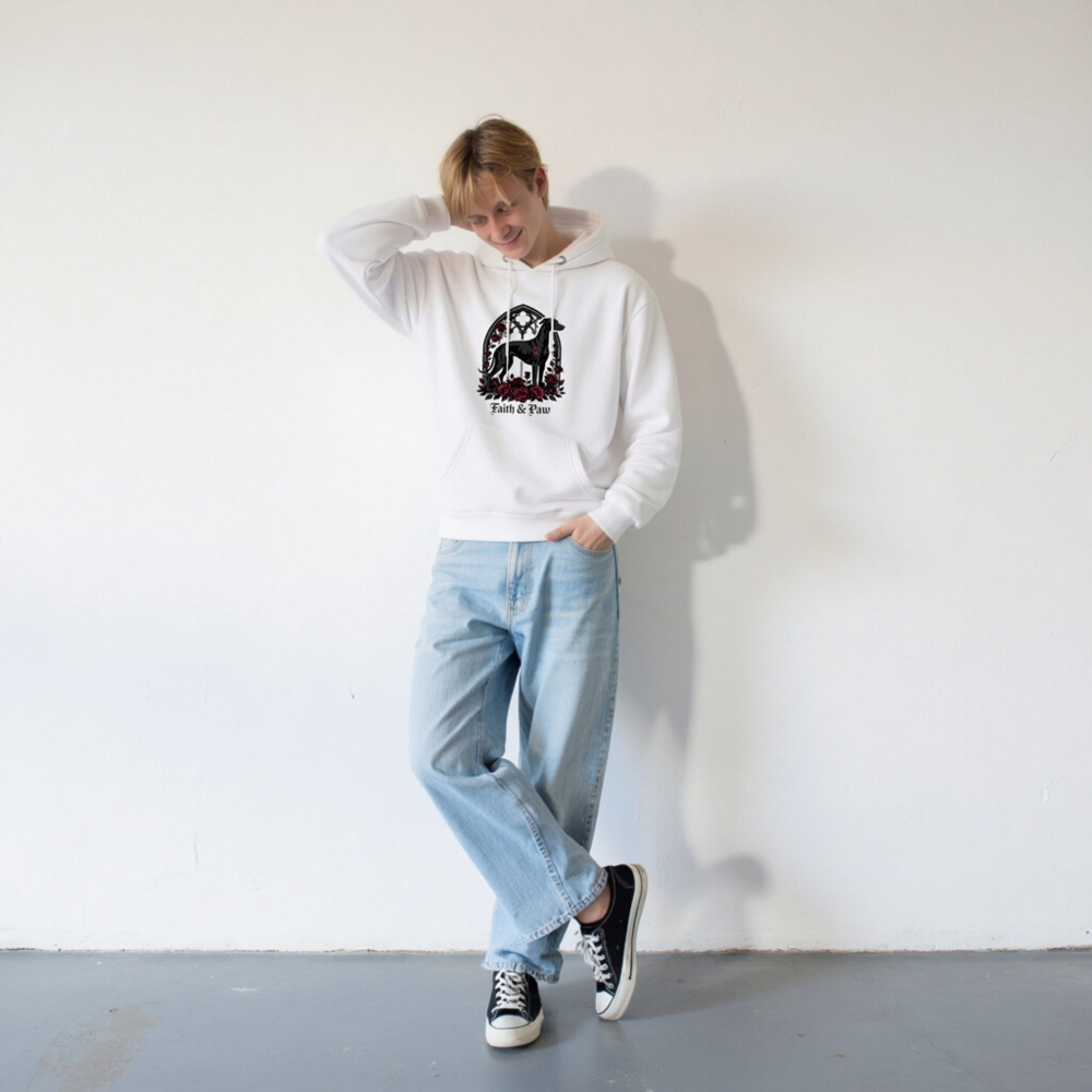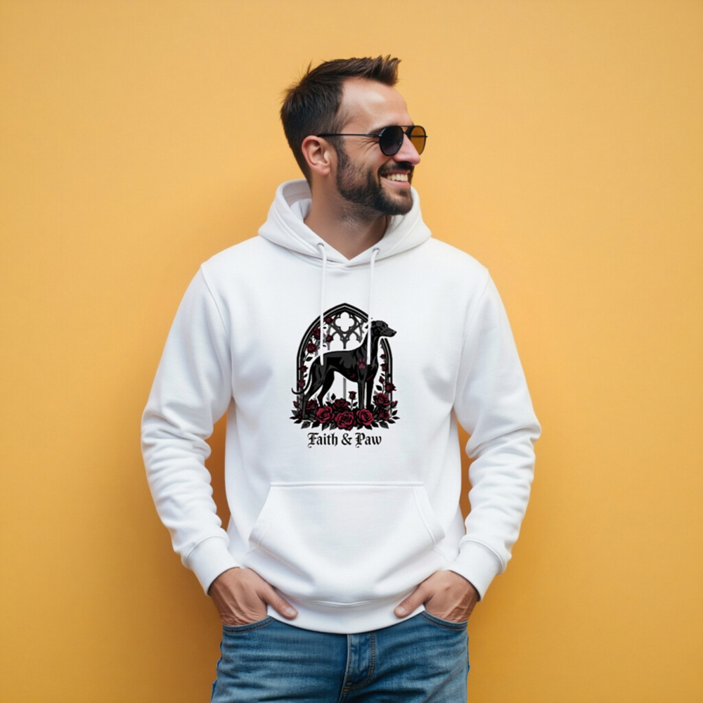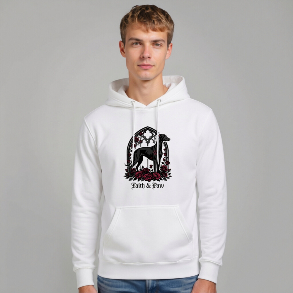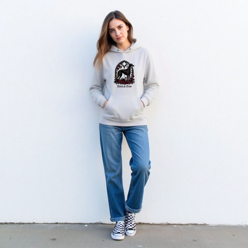 Premium unisex pullover hoodie featuring a striking black greyhound silhouette within a gothic arched window, surrounded by deep red roses and a paw print. Soft, comfortable cotton blend with front pouch pocket and drawstring hood. ‘Faith & Paw’ text adds meaningful charm. Ideal for dog lovers who appreciate gothic elegance and heartfelt pet devotion.