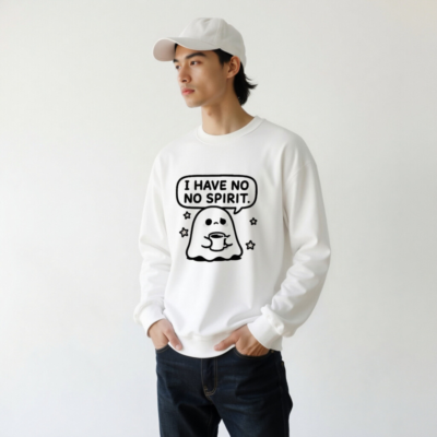 Cute unisex crew neck sweatshirt featuring a kawaii ghost holding a coffee mug with the humorous quote ‘I HAVE NO NO SPIRIT.’ Perfect for Halloween, cozy days, or anyone who needs a dose of humor. Soft, comfortable fit—ideal for casual wear. Black-and-white graphic design on white fabric. Unisex sizing, machine washable. A playful take on spooky season with a relatable twist.