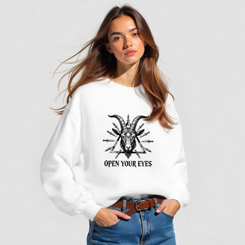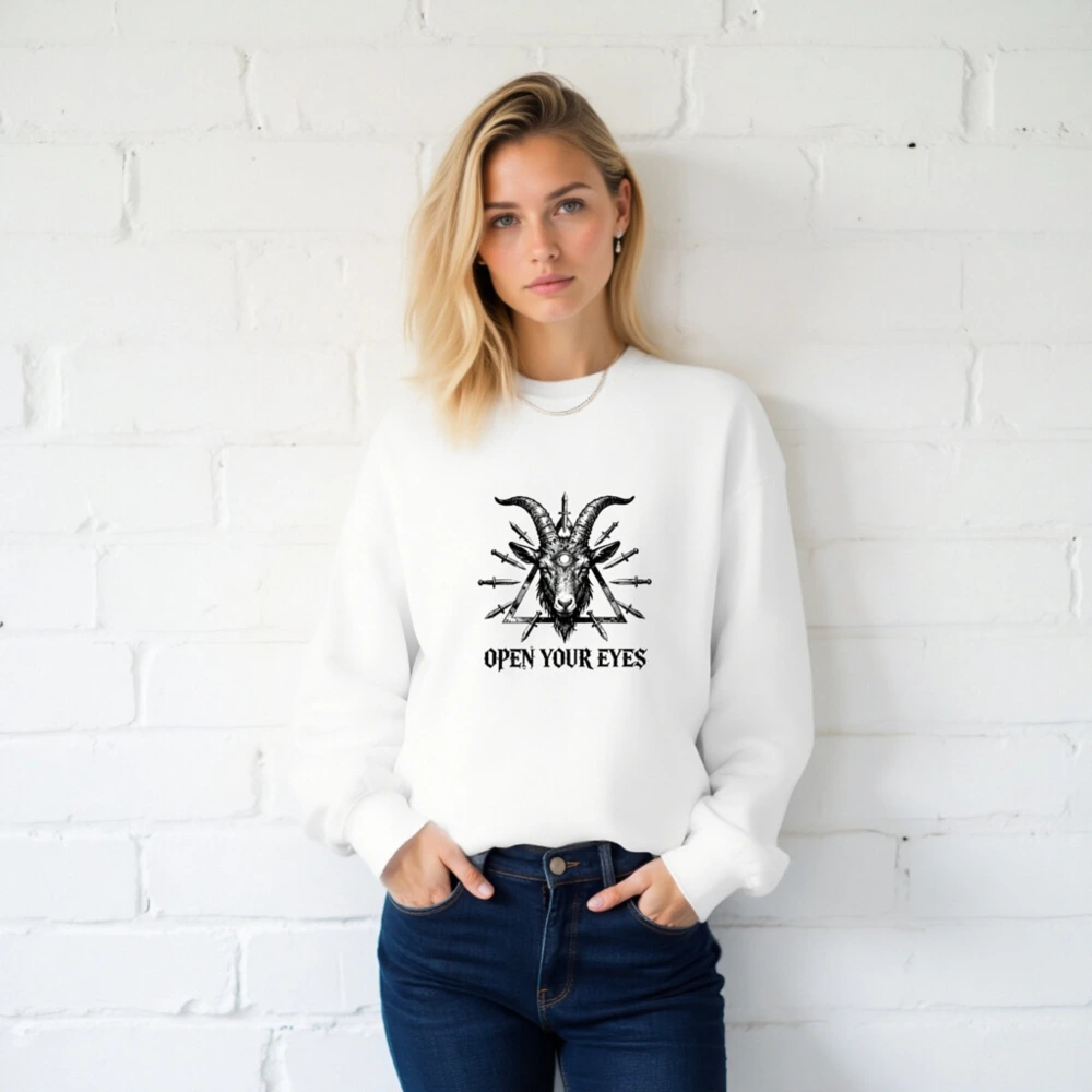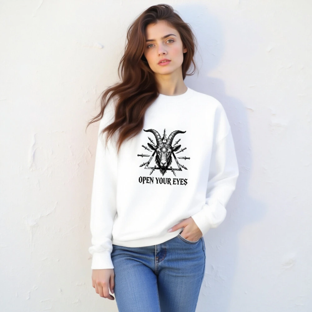 This unisex crew neck sweatshirt features a striking black-and-white goat head with third eye, surrounded by daggers inside a triangle—inspired by occult symbolism. The bold ‘OPEN YOUR EYES’ text adds philosophical depth. Made from soft, durable fabric for everyday comfort. Perfect for alternative, goth, or mystic fashion lovers seeking meaningful, high-contrast streetwear. Ideal for layering or standalone wear.