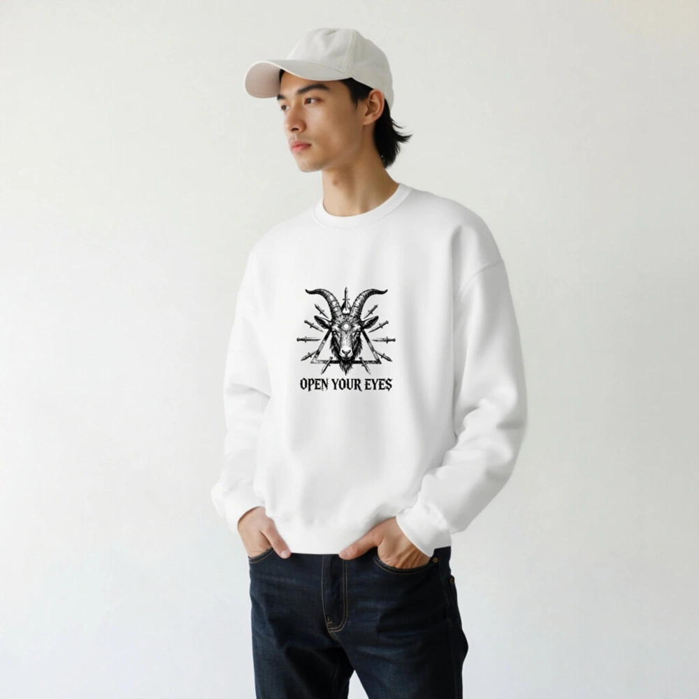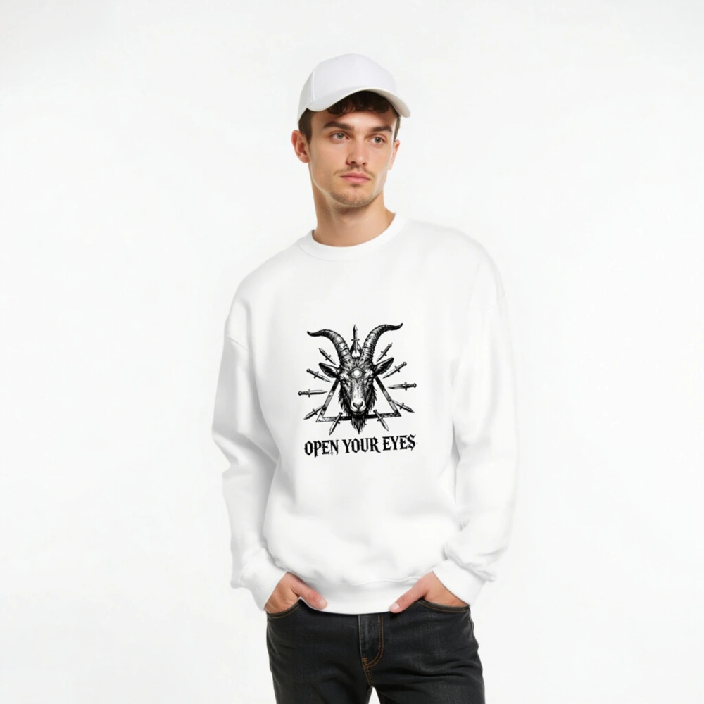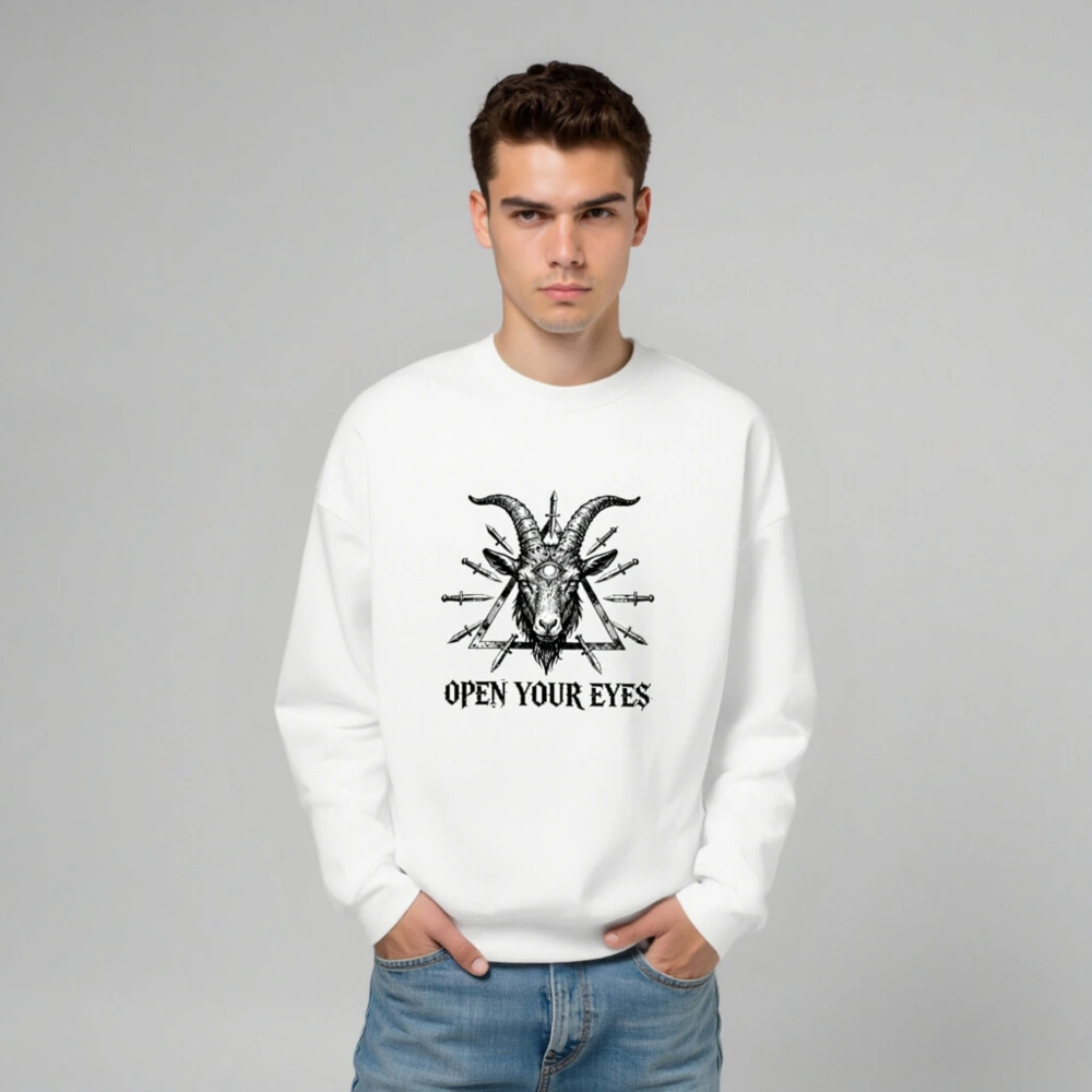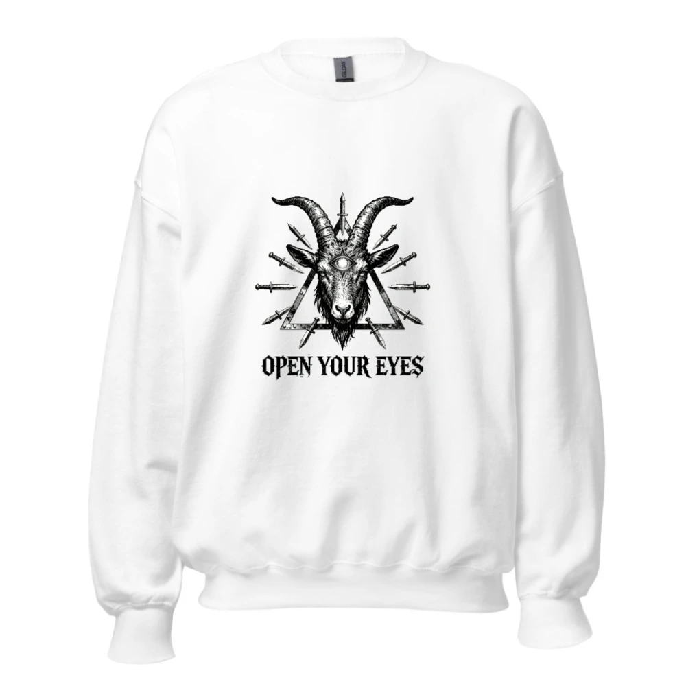 This unisex crew neck sweatshirt features a striking black-and-white goat head with third eye, surrounded by daggers inside a triangle—inspired by occult symbolism. The bold ‘OPEN YOUR EYES’ text adds philosophical depth. Made from soft, durable fabric for everyday comfort. Perfect for alternative, goth, or mystic fashion lovers seeking meaningful, high-contrast streetwear. Ideal for layering or standalone wear.