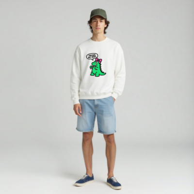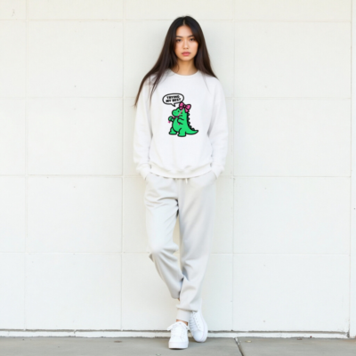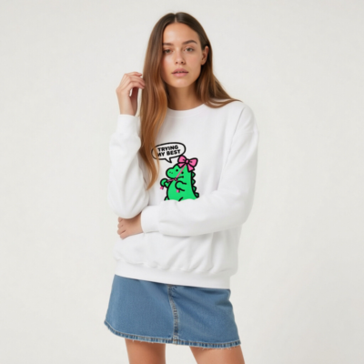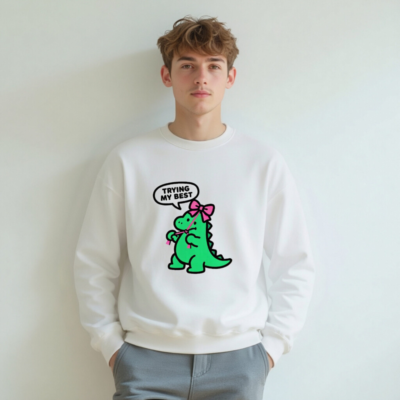 Adorable unisex crew neck sweatshirt featuring a cute green dinosaur with pink bow and speech bubble saying ‘TRYING MY BEST’. Soft, comfortable fit for everyday wear. Classic white base with playful kawaii design—perfect for fans of quirky, motivational apparel. Machine washable, durable print. Ideal gift for kids, teens, or anyone who loves dinosaurs and positive vibes.