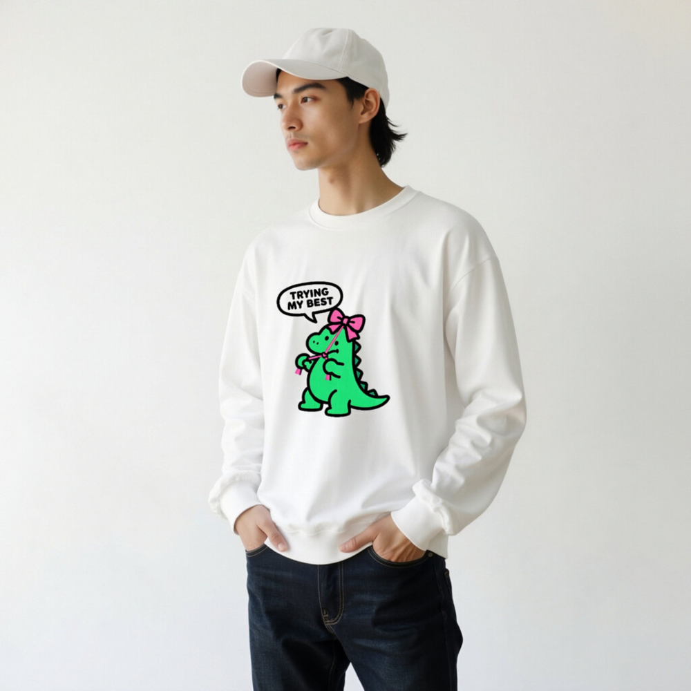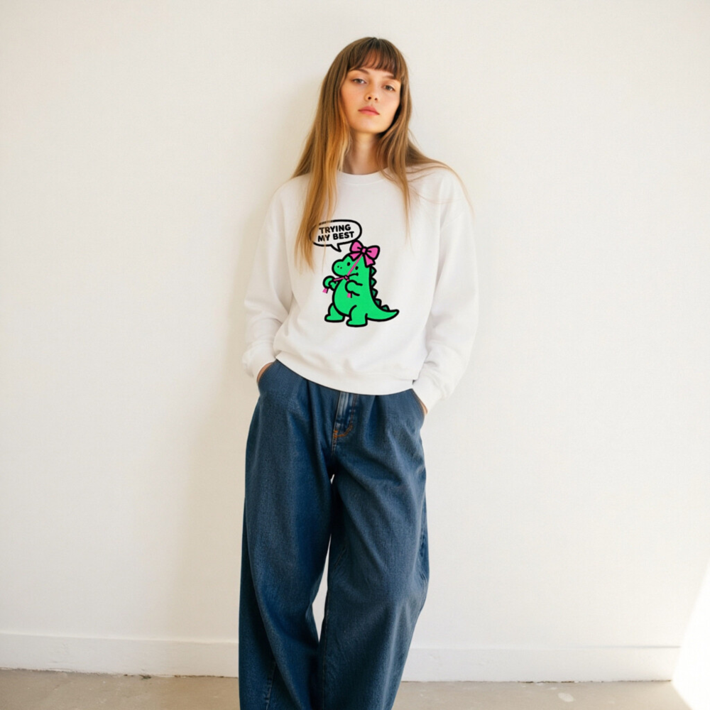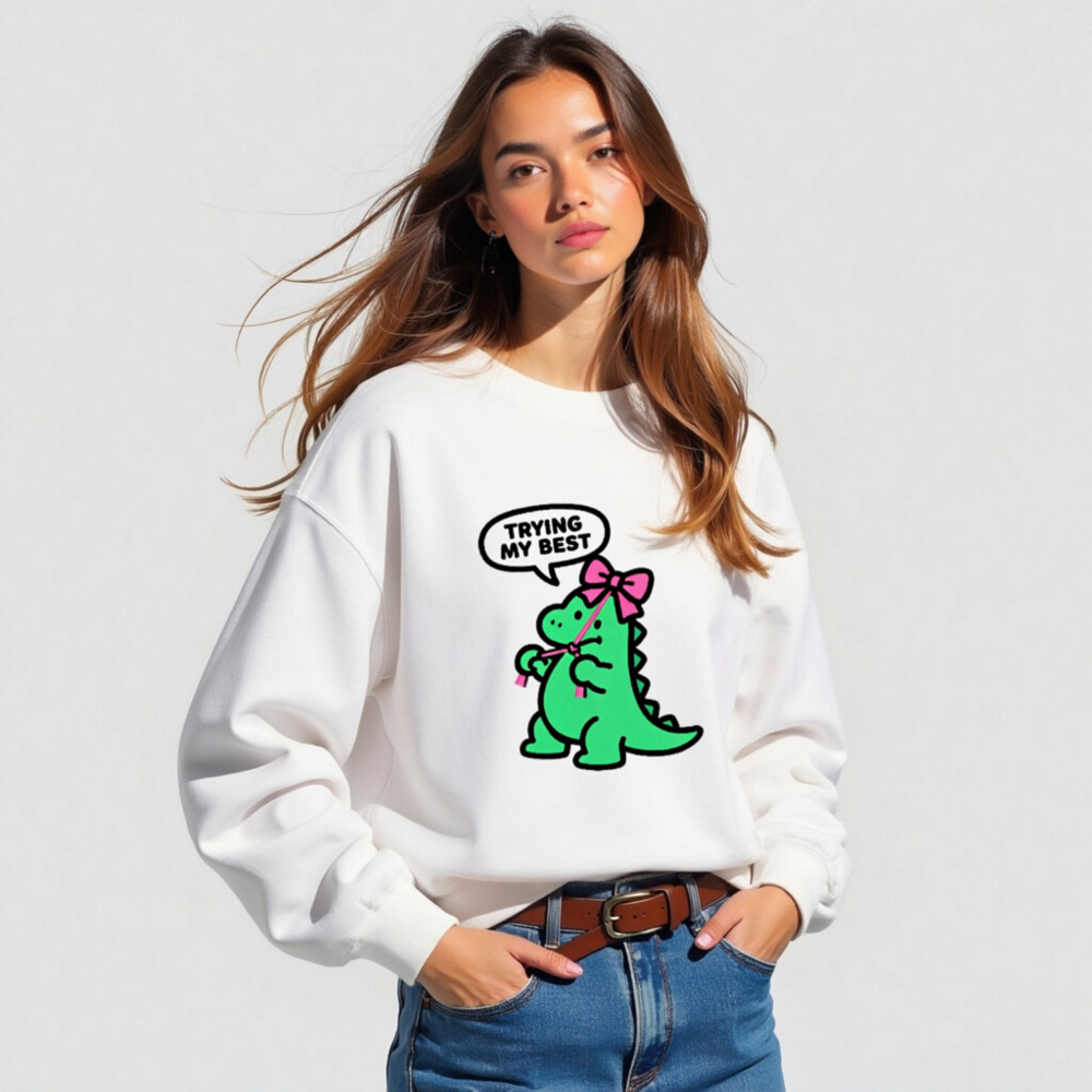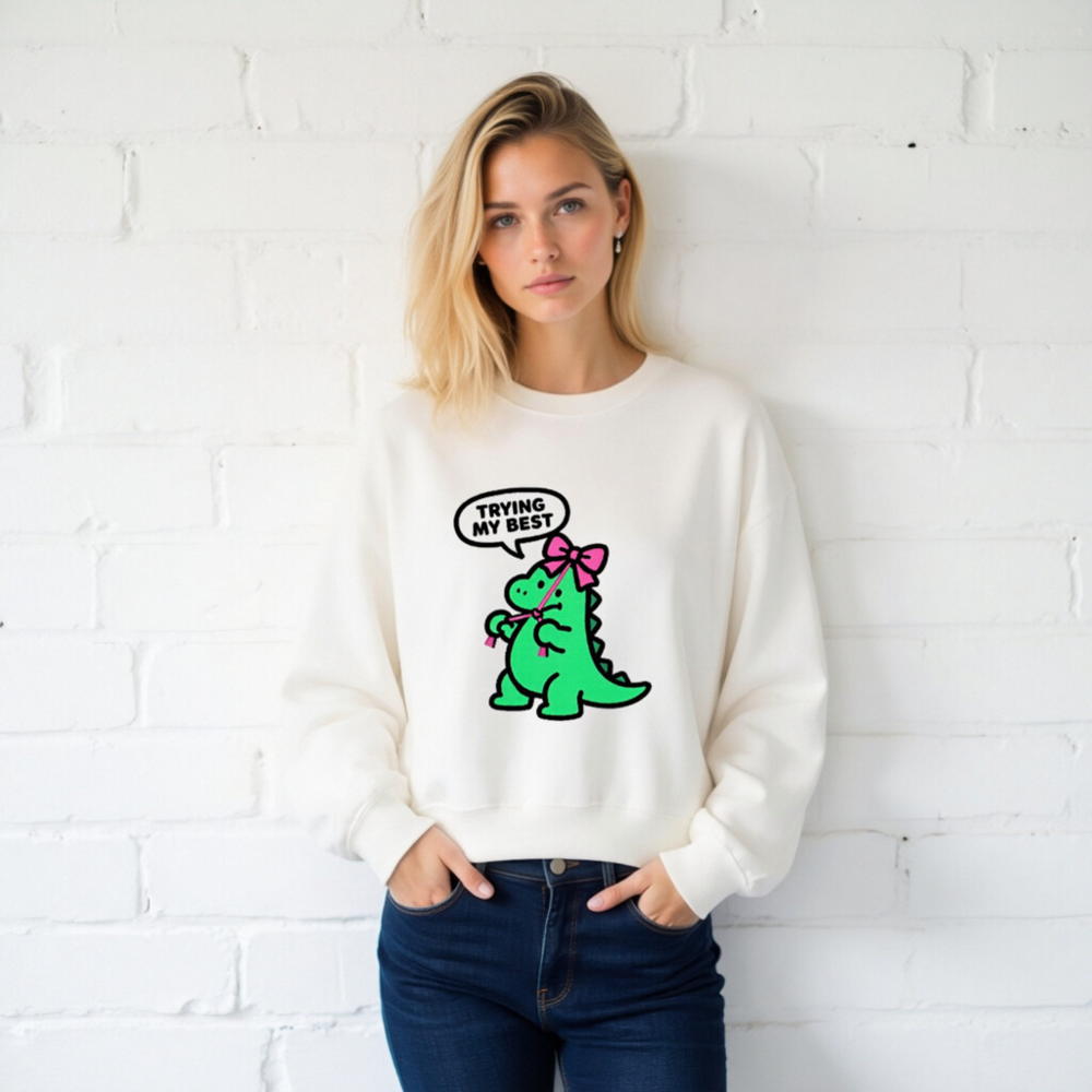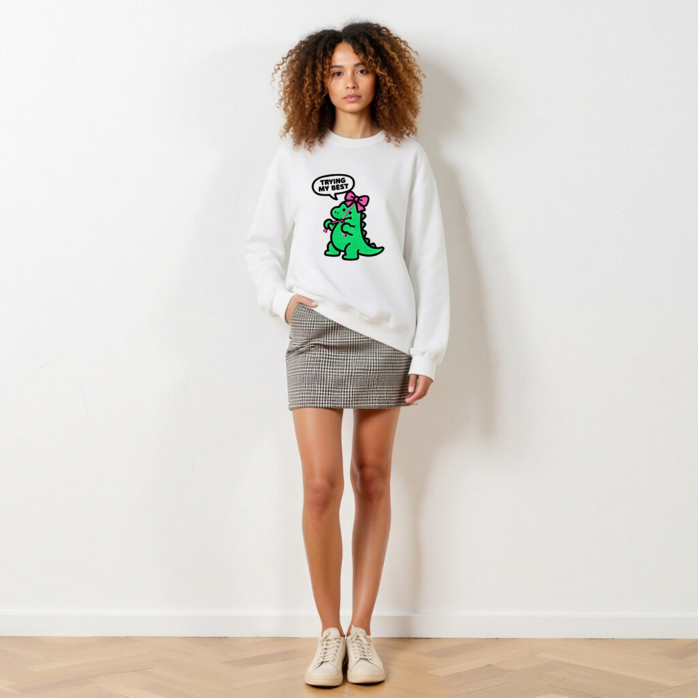 Adorable unisex crew neck sweatshirt featuring a cute green dinosaur with pink bow and speech bubble saying ‘TRYING MY BEST’. Soft, comfortable fit for everyday wear. Classic white base with playful kawaii design—perfect for fans of quirky, motivational apparel. Machine washable, durable print. Ideal gift for kids, teens, or anyone who loves dinosaurs and positive vibes.