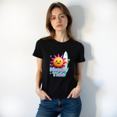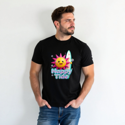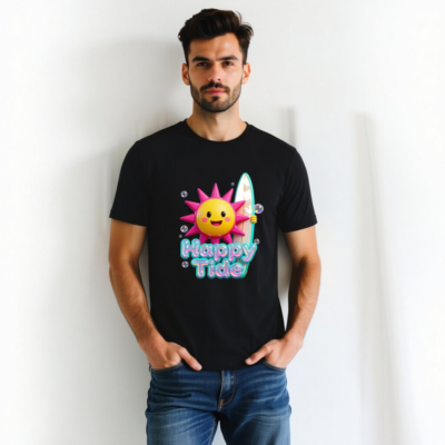 This unisex black staple t-shirt features a vibrant ‘Happy Tide’ graphic: a smiling sun with pink spikes holding a surfboard, surrounded by bubbles. Perfect for beach lovers and summer vibes—soft, comfortable, and designed for everyday wear. Ideal for casual outings, vacations, or as a fun gift. Available in all sizes for men, women, and kids.