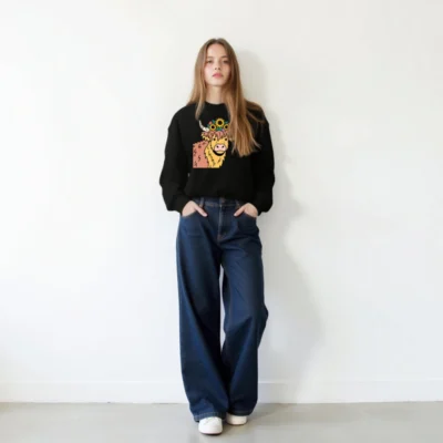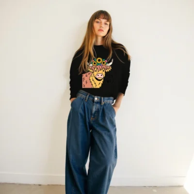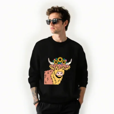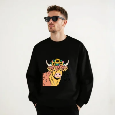 This unisex crew neck sweatshirt features a charming illustrated Highland cow with sunflower crown and ‘Stay Wild’ speech bubble. Soft, comfortable fit for everyday wear. Designed for casual style lovers who embrace nature-inspired, playful aesthetics. Ideal gift for animal & floral enthusiasts.
