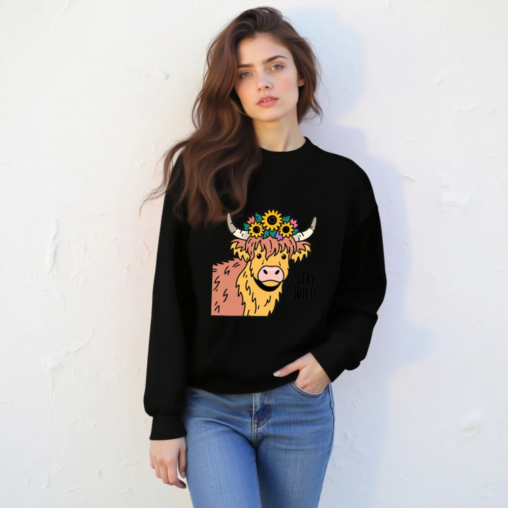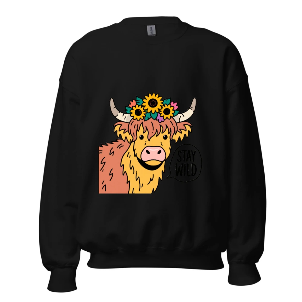Unisex Highland Cow Sweatshirt – Floral Horns & Stay Wild Graphic, Crew Neck