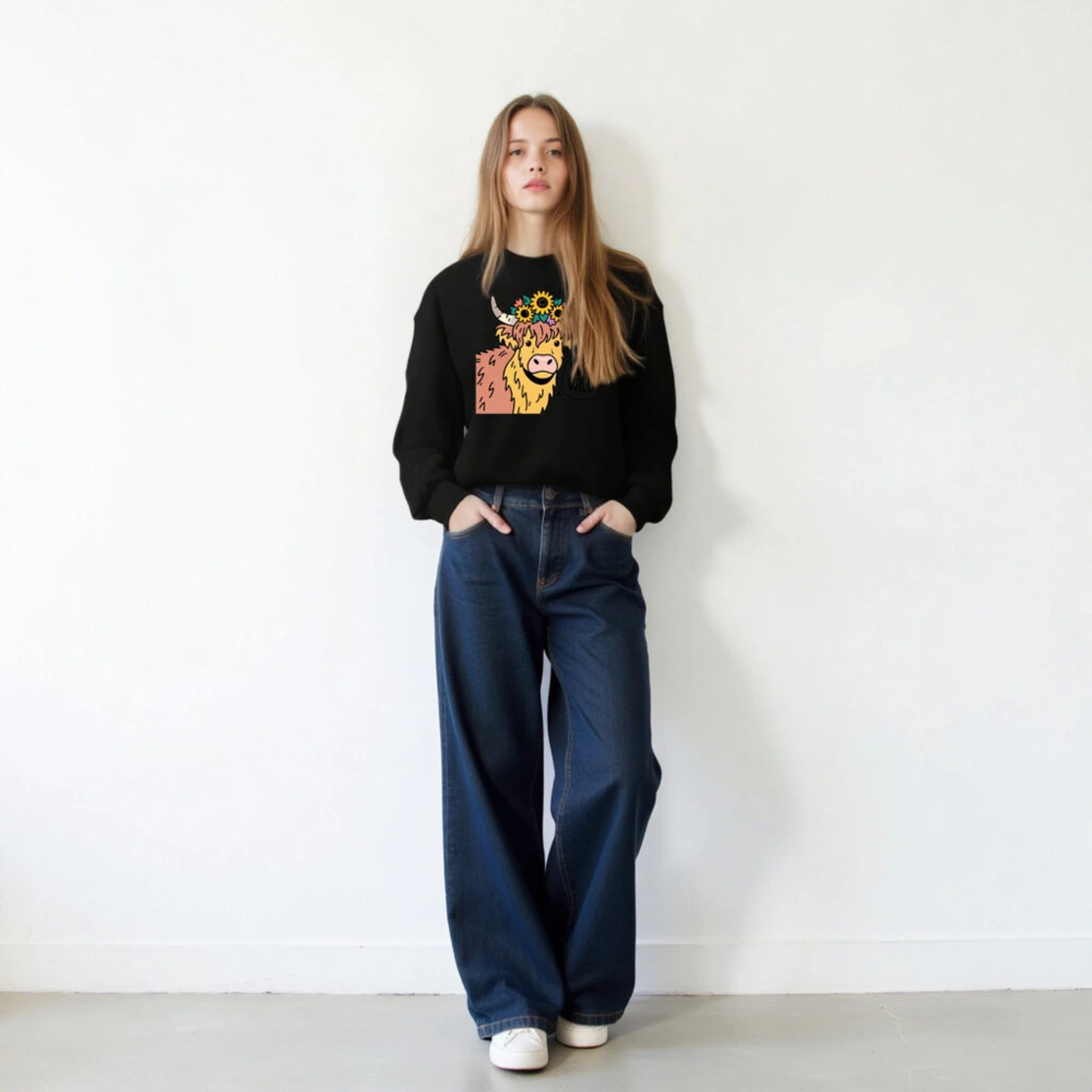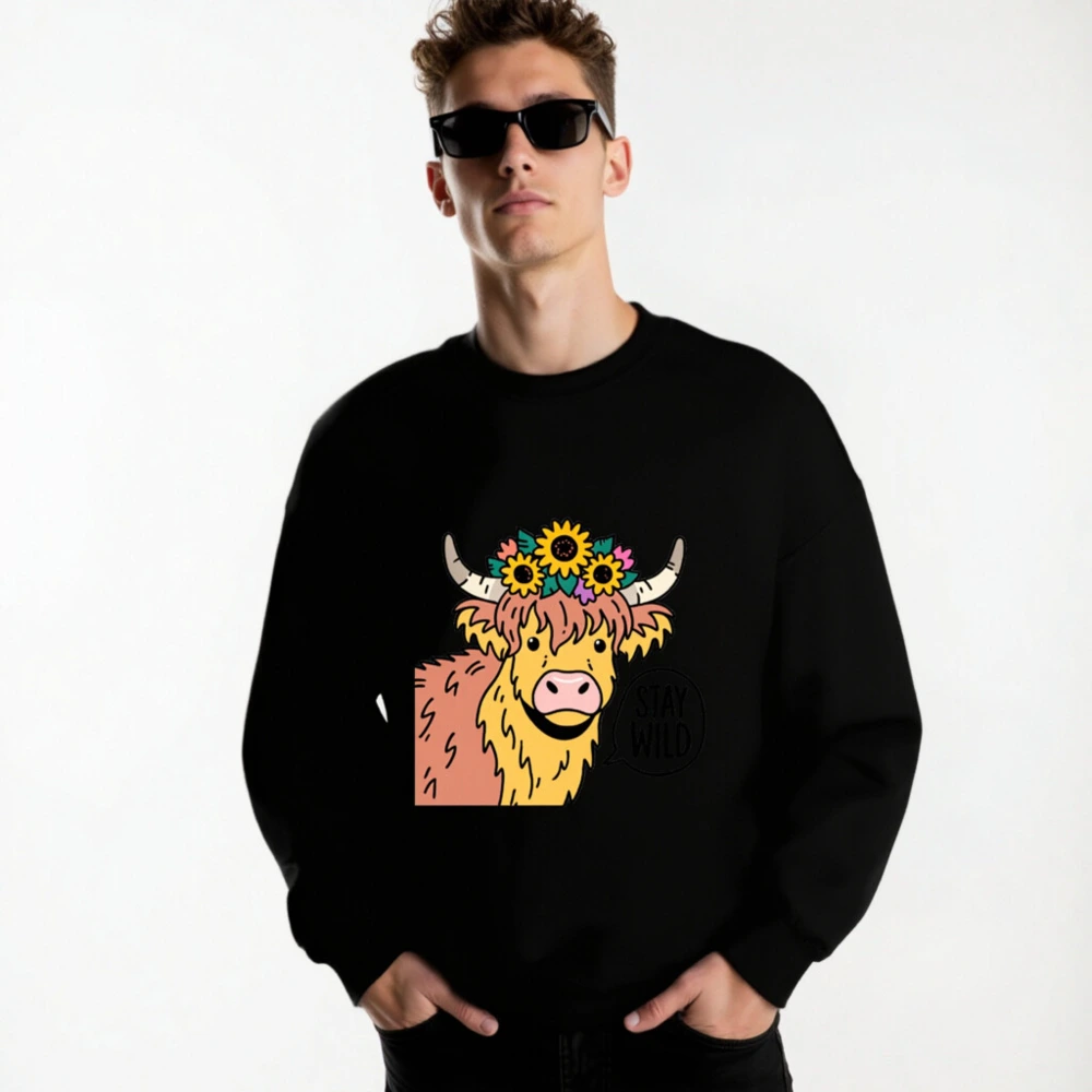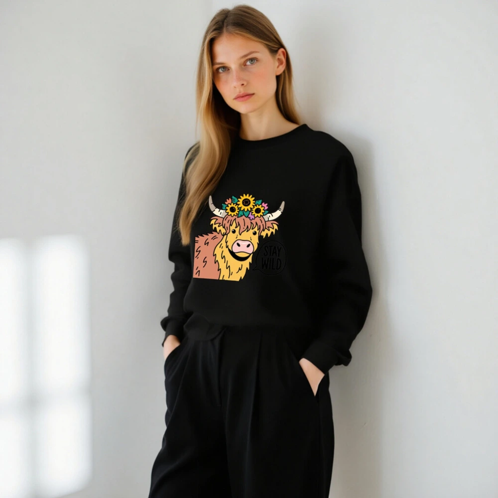 This unisex crew neck sweatshirt features a charming illustrated Highland cow with sunflower crown and ‘Stay Wild’ speech bubble. Soft, comfortable fit for everyday wear. Designed for casual style lovers who embrace nature-inspired, playful aesthetics. Ideal gift for animal & floral enthusiasts.