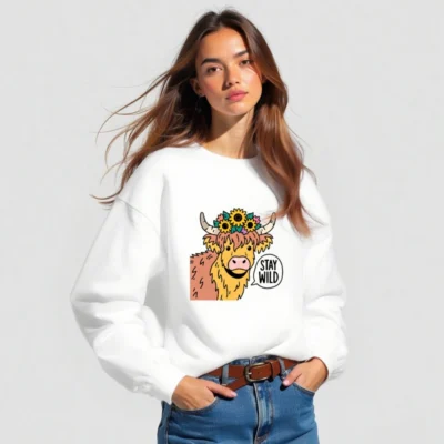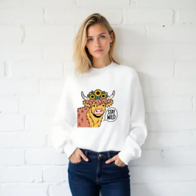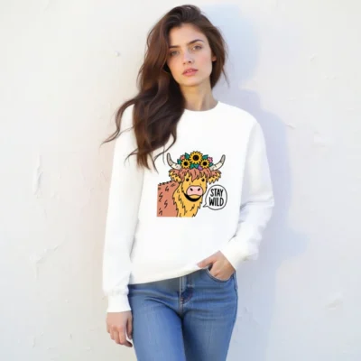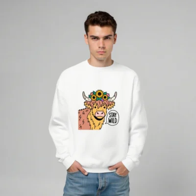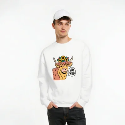 This unisex crew neck sweatshirt features a cheerful Highland cow with sunflowers and horns, paired with the bold ‘STAY WILD’ speech bubble. Soft, comfortable, and stylish—perfect for nature lovers and animal enthusiasts. Ideal for casual wear, gifts, or expressing your wild spirit. Available in all sizes for men, women, and kids.