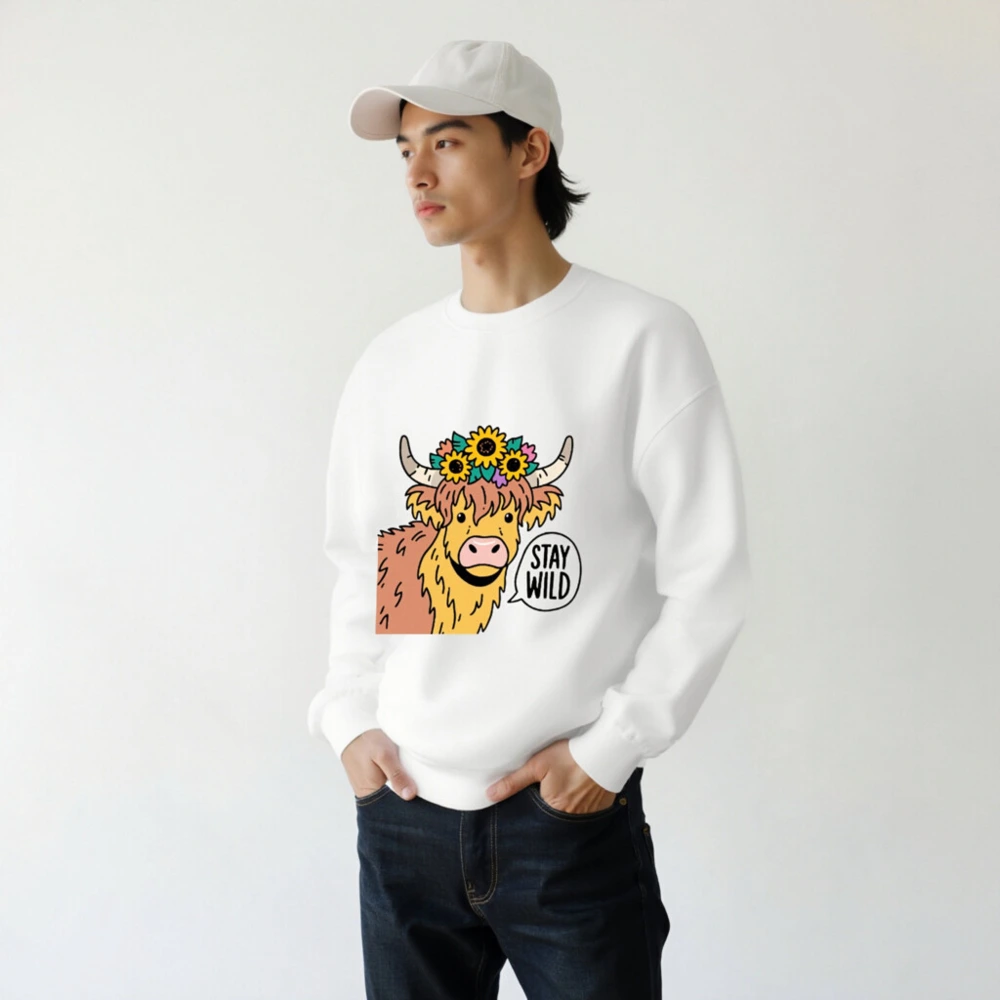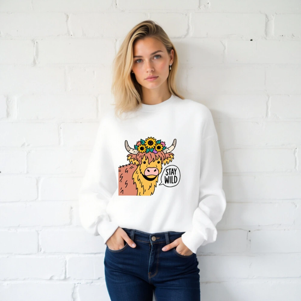 This unisex crew neck sweatshirt features a cheerful Highland cow with sunflowers and horns, paired with the bold ‘STAY WILD’ speech bubble. Soft, comfortable, and stylish—perfect for nature lovers and animal enthusiasts. Ideal for casual wear, gifts, or expressing your wild spirit. Available in all sizes for men, women, and kids.